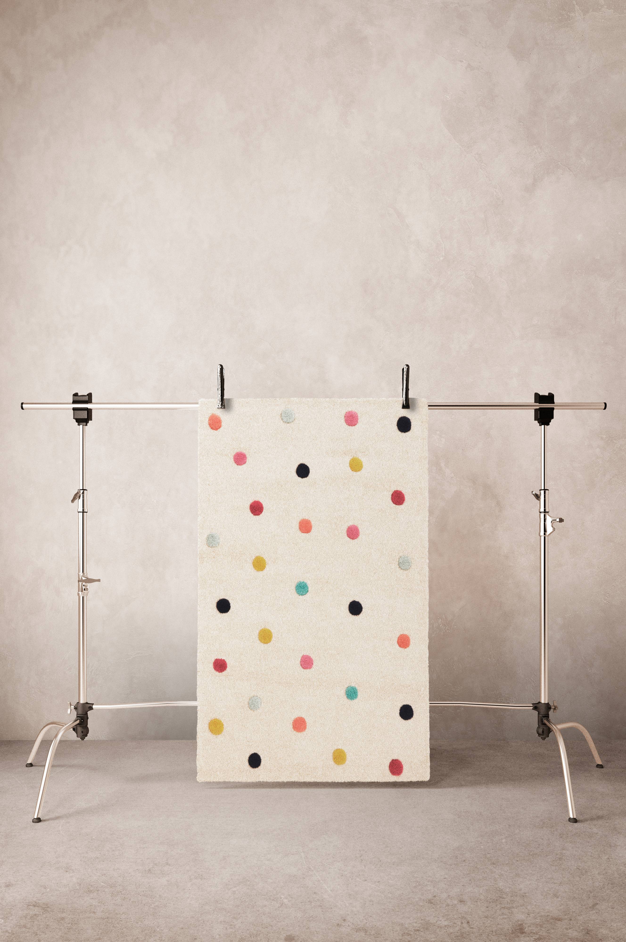 Dywan dziecięcy z ręcznie wszywaną przędzą wykonany z miękkiej bawełny, z radosnym wzorem w kropki z kolorowego włosia o różnej długości. Wesoły dywan, dzięki któremu pokój dziecięcy będzie uroczy i przytulny. Długość włosia w tkanych obszarach: 0,4-0,5 cm; długość przyciętego włosia: 0,9-1 cm. Grubość 1-1,2 cm. 2500-2700 g/m².