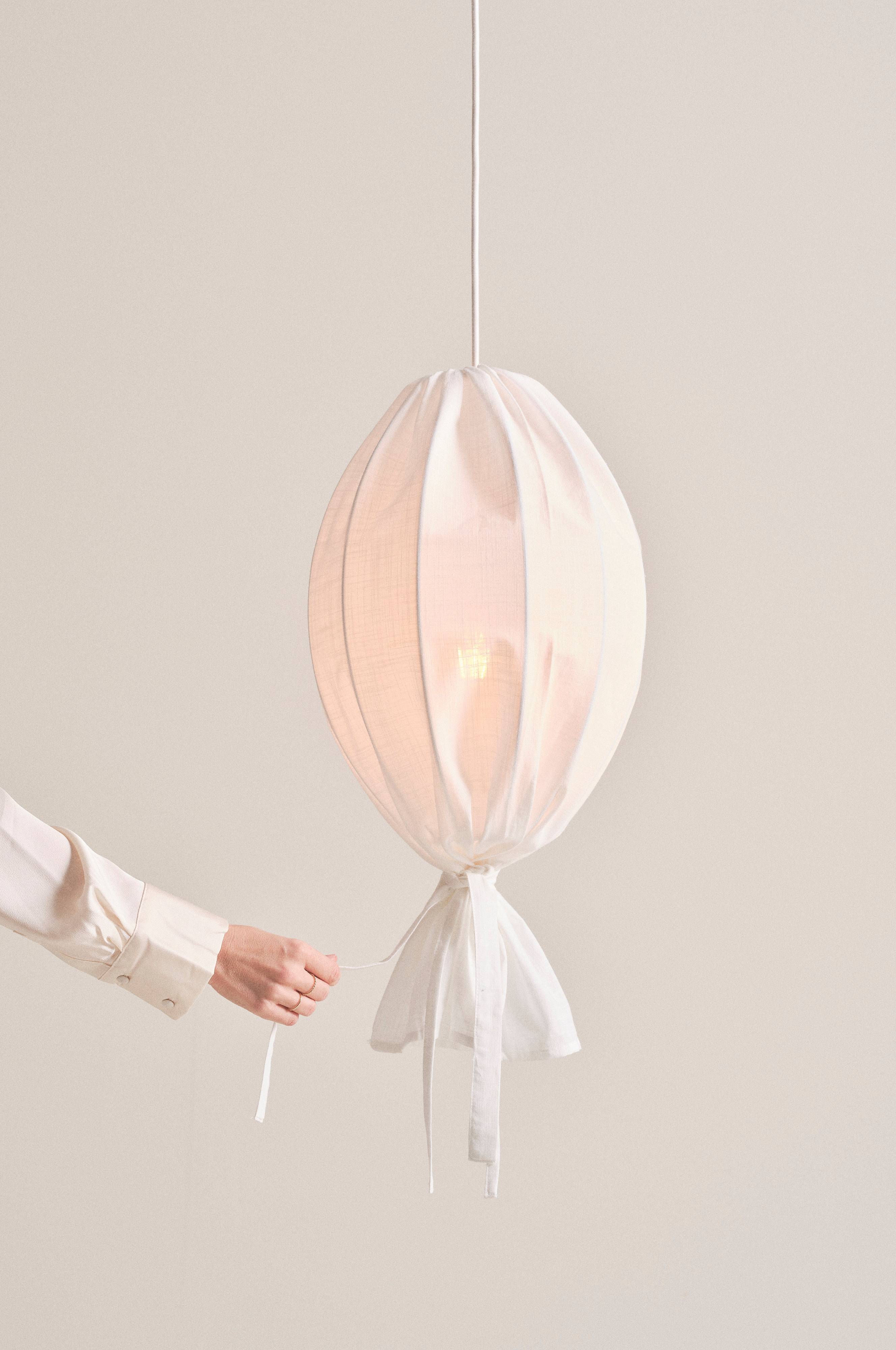 Lampa sufitowa z eleganckiej lnianej tkaniny, która w dolnej części jest spięta opaską komponującą się z całością. Stelaż lampy wykonany jest z metalu nadając jej piękny kształt, kolor tkaniny sprawia, że lampa roztacza nastrojowe światło. Biały przewód w oplocie tekstylnym, puszka sufitowa z plastiku. Lampa nie jest uziemiona, klasa 2. Ze względu na regulacje unijne, w niektórych krajach wymagany jest dodatkowy przełącznik sufitowy. Przełącznik sufitowy powinien być nieuziemiony (klasa 2) i jest dostępny do kupienia oddzielnie.