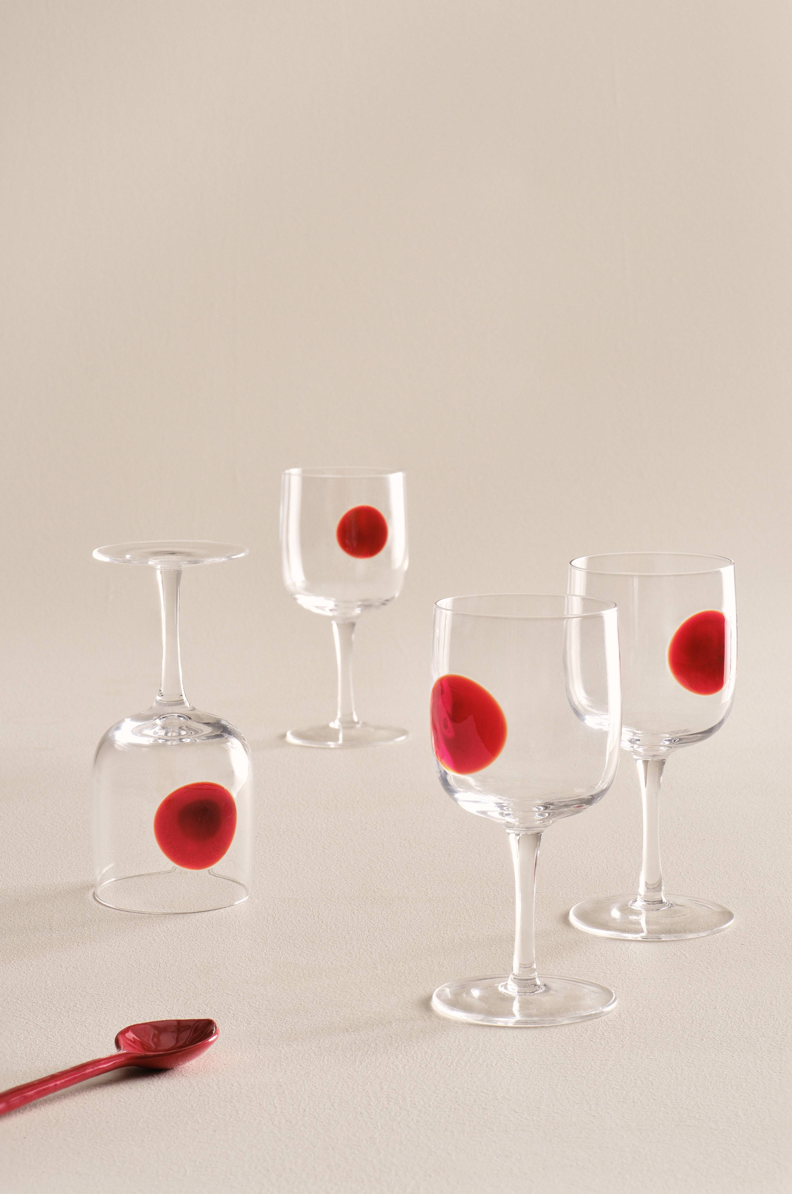 Urok kieliszków do wina. Zestaw 4 kieliszków do wina DART wzbogaci Twoją kuchnię i salon. Przezroczyste szkło ozdobione żywymi kropkami. Każdy element, ręcznie wykonany i wyjątkowy, opowiada własną historię. Część rodziny pasujących do siebie przedmiotów DART. Idealne do modnych i nowoczesnych wnętrz.