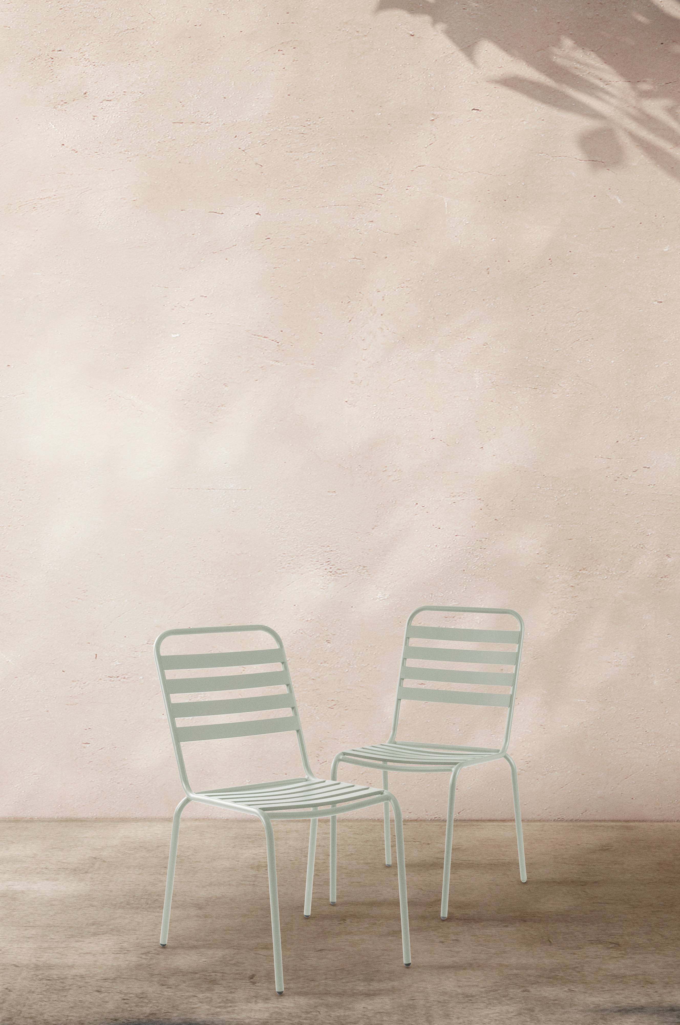 Zestaw dwóch krzeseł z lakierowanego proszkowo aluminium. Praktyczne w każdych okolicznościach, ten zgrabny model pasuje również na balkon. DEIA wykonane są z aluminium, mogą więc być wystawione na zewnątrz bez ryzyka, że pokryją się rdzą, są również łatwe do wytarcia. Krzesła można ustawić jedno na drugim.