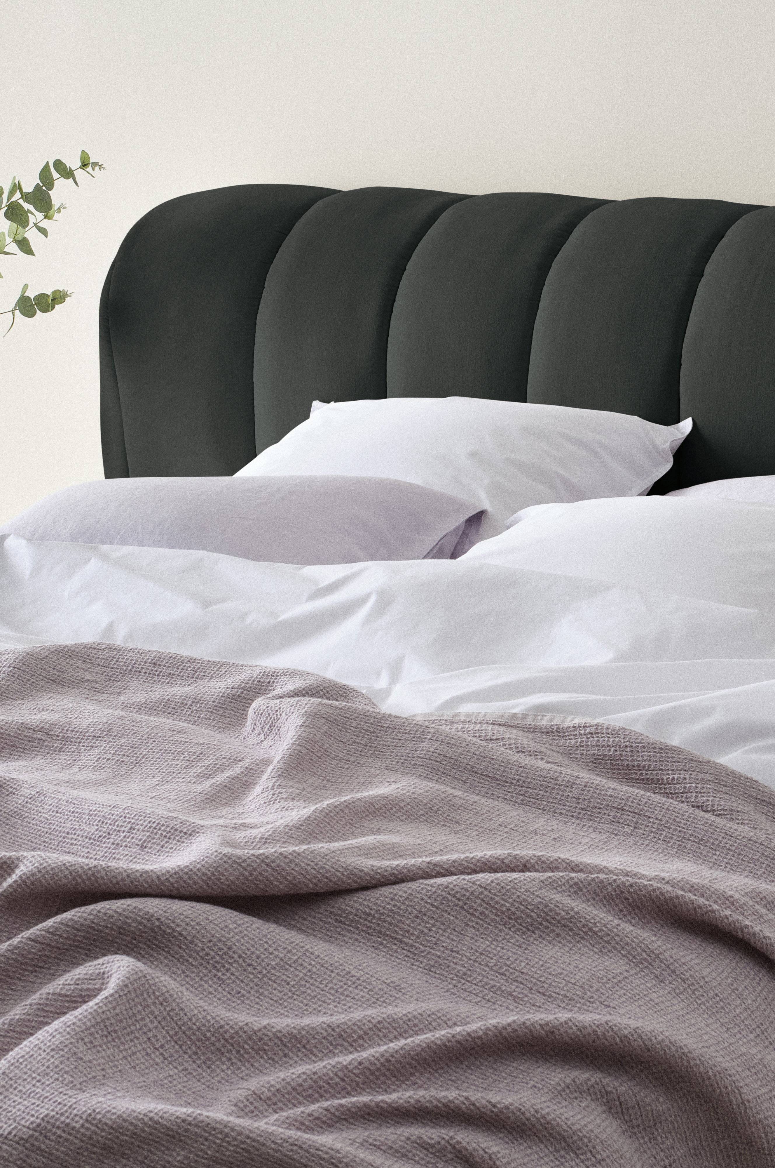 Zagłówek o miękkim i zaokrąglonym kształcie, bardzo szeroki i kuszący. Zagłówek jest pokryty miękkim watowaniem i obity neutralną, łatwą do dopasowania, jednokolorową tkaniną poliestrową. Pięknego designu dopełniają pionowe szwy. Wszystkie drewniane elementy wykonane są z drewna posiadającego certyfikat FSC. Rama wykonana jest z drewna sosnowego i sklejki. Zagłówek nie jest mocowany do ściany, ale jest bardzo stabilny. Materac klasyczny/materac sprężynowy sprzedawany jest osobno.