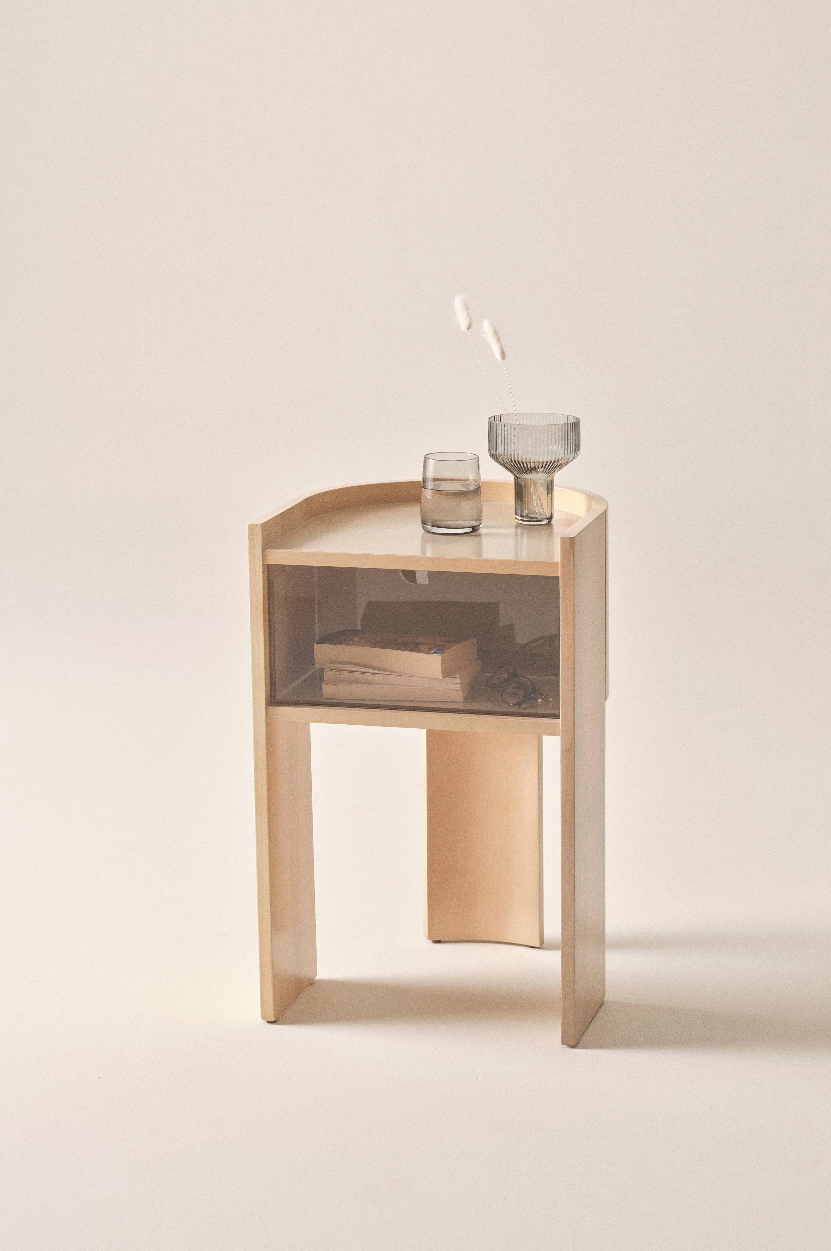 Starannie wykonana i solidna szafka nocna ze sklejki, płyty MDF oraz litej sosny, z miękką, bieloną powierzchnią i lakierowanym wykończeniem. Szafka ma półokrągły kształt, nieco wyższą krawędź wokół blatu oraz trzy ładne i stabilne nogi. Szufladę wykonano z przejrzystego szkła akrylowego i wyposażono w niewielki otwór, dzięki któremu łatwo się ją wysuwa. Szuflada jest wyposażona w mały, dyskretny ogranicznik na tylnej krawędzi, dzięki czemu nie wyciągniesz jej zbyt gwałtownie i nie, a zawartość nie wyląduje na podłodze. DEXX to niezwykła szafka nocna, o solidnym wyglądzie i z drobnymi detalami.