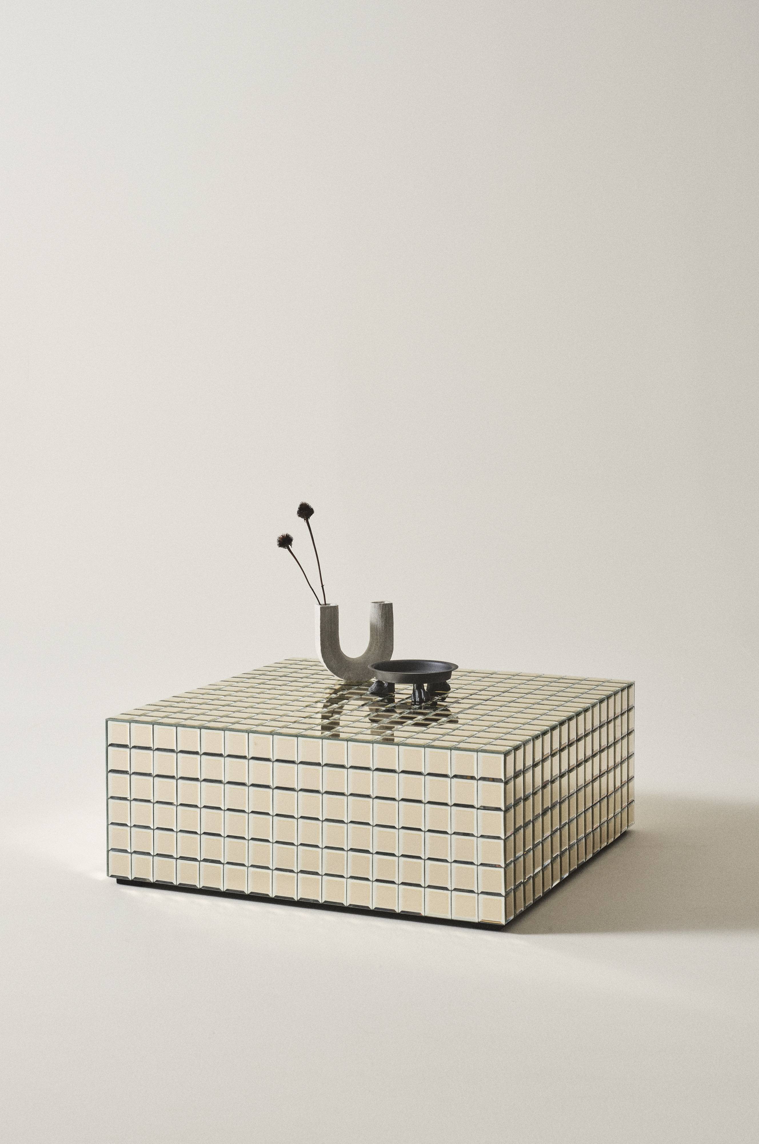 Kwadratowy stolik kawowy pokryty mozaiką wykonaną ze szkła lustrzanego. Każdy element mozaiki ma oszlifowane brzegi. Rama wykonana jest z płyty MDF oznaczonej certyfikatem FSC. Ten luksusowy stolik kawowy wzbogaci wnętrze i nada mu wytworny wygląd. Niewielka wysokość stolika nadaje wnętrzom wygodną hotelową atmosferę.