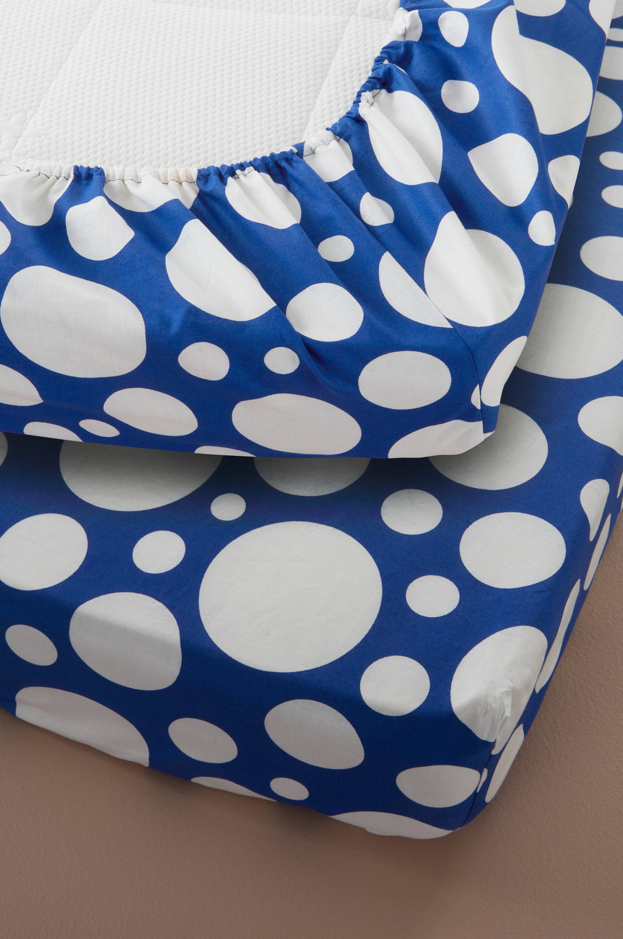 Prześcieradło z gumką z pięknej bawełny z nadrukowanymi białymi kropkami i wszytymi w rogach gumkami. Bawełna to zawsze chłodna i świeża tkanina, która jest bardzo przyjemna dla skóry. Gumki wszyte w krawędzie prześcieradła utrzymują je na miejscu. Gęstość splotu materiału wynosi 144 TC. (Gęstość splotu materiału oznacza ilość przeplecionych ze sobą nici, thread count, na cal kwadratowy materiału. Im wyższa gęstość tym lepsza jakość.)