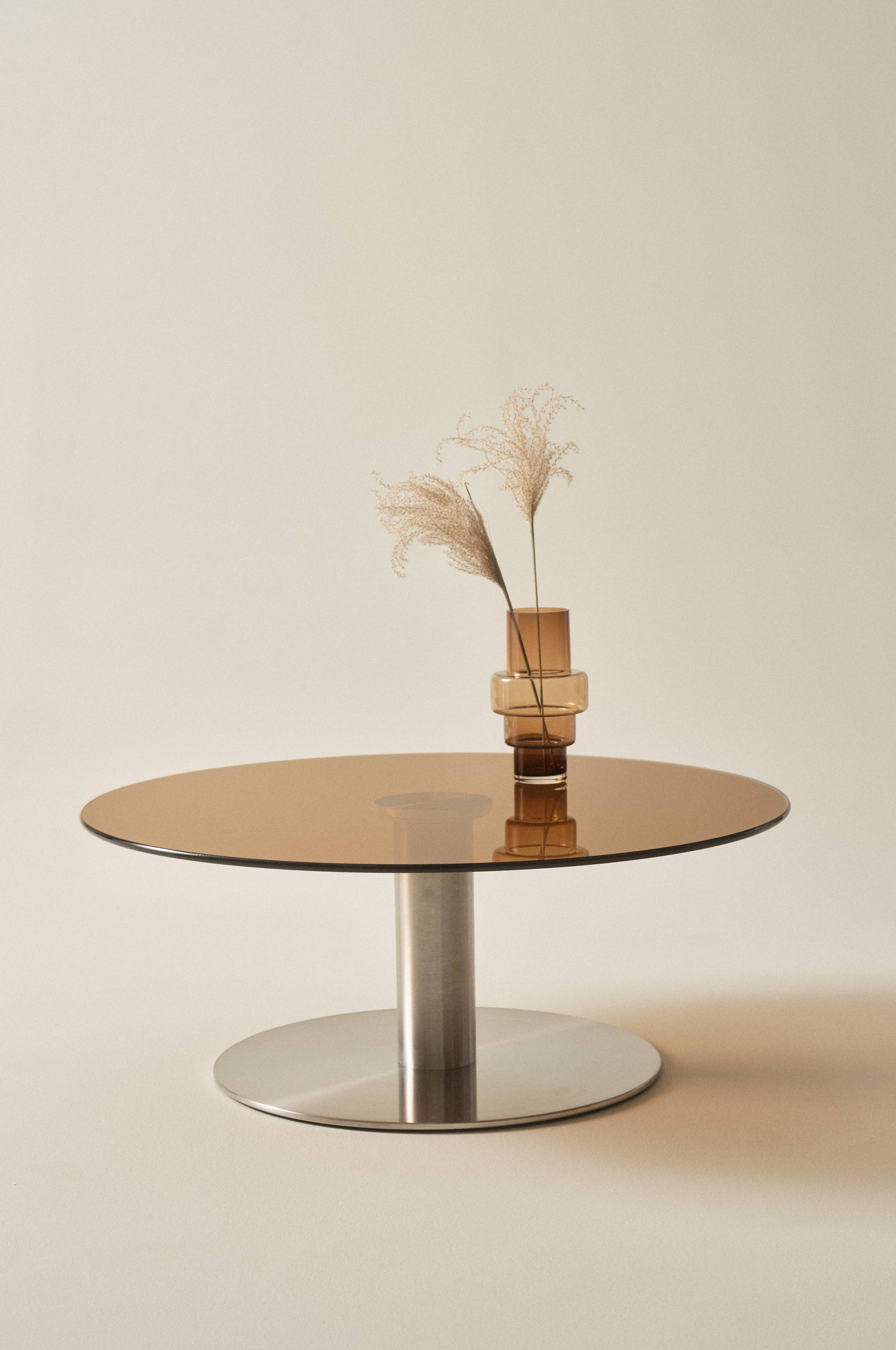 Okrągły stolik kawowy z blatem ze szkła oraz nogą ze stali nierdzewnej, której powierzchnia została wyszczotkowana. Noga jest prosta, stylowa i wspaniale współgra ze szklanym blatem, którego środek tworzy piękny punkt centralny w miejscu, w którym noga jest widoczna spod blatu. Niewielka wysokość stolika ustawionego obok sofy zachęci do wypoczynku. Wymaga częściowego montażu. Do produktu dołączona jest instrukcja montażu.