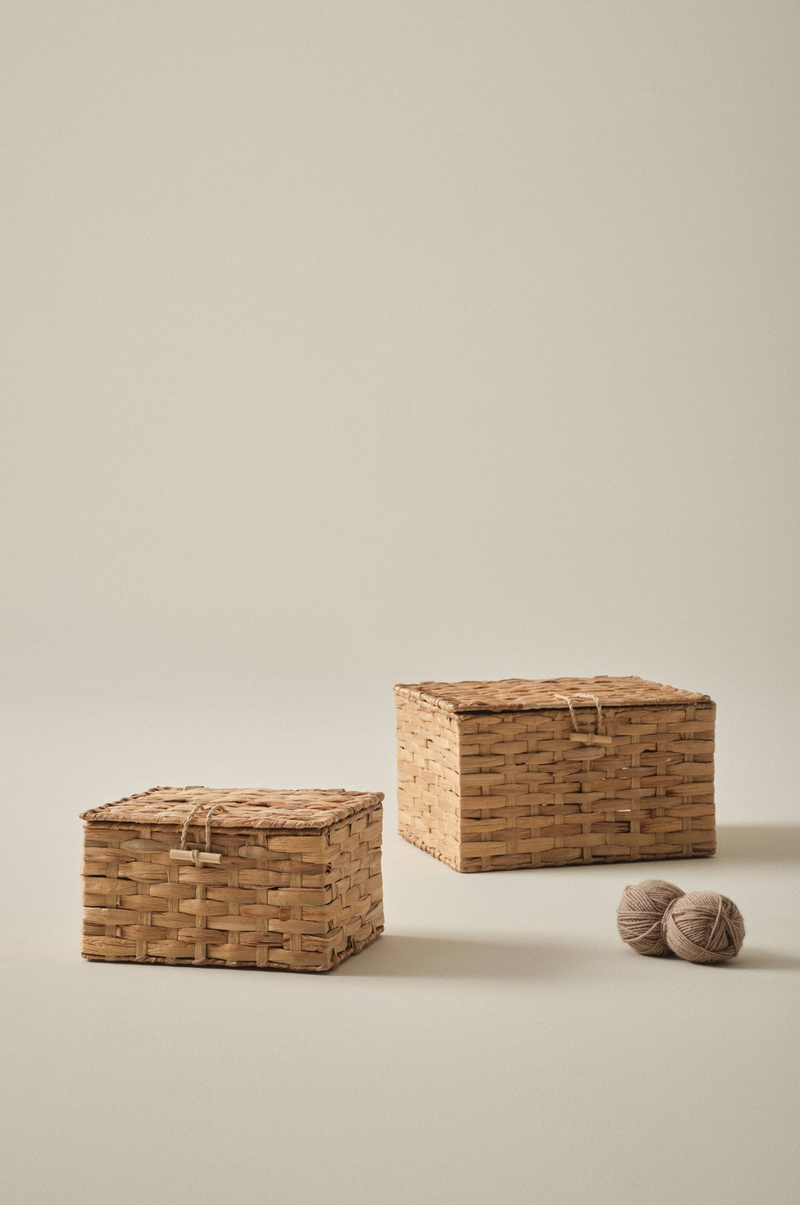 2 kosze do przechowywania ręcznie plecione z hiacyntu wodnego. Kwadratowe kosze otrzymały kształt pudełka z pokrywką. Niewielka pętelka wokół patyczka tworzy zamknięcie dla przykrywki. Kosze zapewnią dekoracyjne miejsce do przechowywania bez względu na miejsce, gdzie je ustawisz, czy będzie to w kuchni, pokoju dziecięcym, łazience lub salonie. Staranne ręczne wykonanie w połączeniu z naturalnym surowcem sprawia, że każdy kosz jest wyjątkowy.