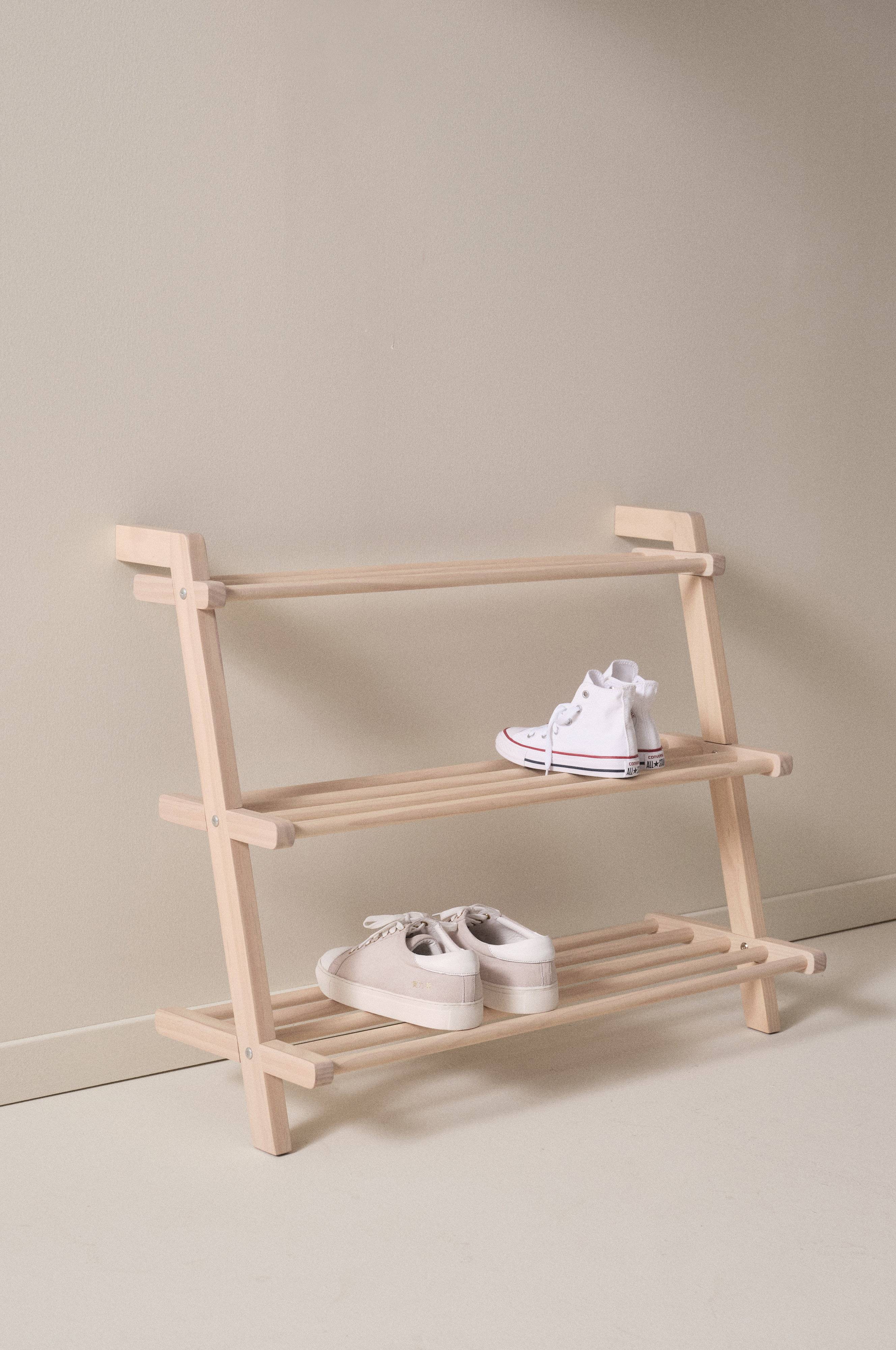 Stojak na obuwie wykonany z drewna sosnowego z certyfikatem FSC. Ten montowany do ściany stojak na obuwie o stylowym, nordyckim designie wyposażony jest w trzy półki. Ten model najbardziej praktyczny będzie ustawiony na podłodze i przymontowany do ściany górną krawędzią. Uchwyty ścienne są ukryte, co gwarantuje estetyczny montaż. Wymaga częściowego montażu.