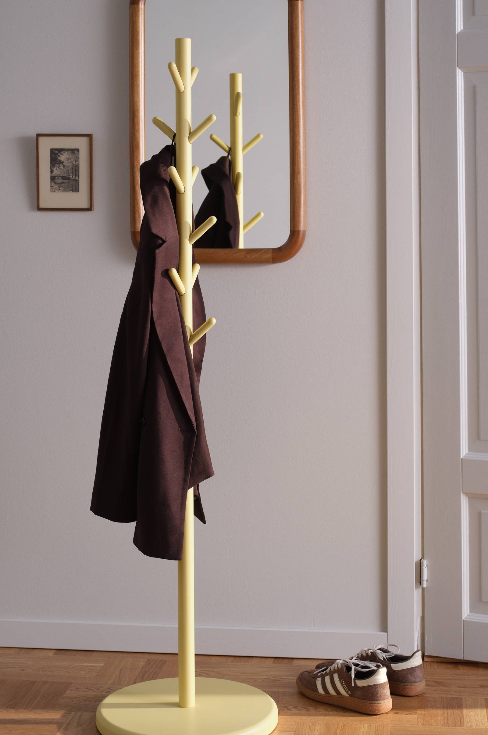 Wieszak na ubrania wykonany z drewna sosnowego z certyfikatem FSC. Ten wolnostojący wieszak o stylowym, nordyckim designie wyposażony jest w 12 prostych kołków do zawieszenia, skierowanych pod kątem ku górze, dzięki czemu ubrania wiszą pewnie i się nie ześlizgują. Produkt jest praktyczny, ponieważ nie wymaga montażu do ściany i może być łatwo przestawiany w miarę potrzeby. Oczywiście świetnie sprawdzi się w przedpokoju, ale będzie przydatny również w sypialni do zawieszenia ubrań, które chcesz mieć pod ręką. Wymaga częściowego montażu.