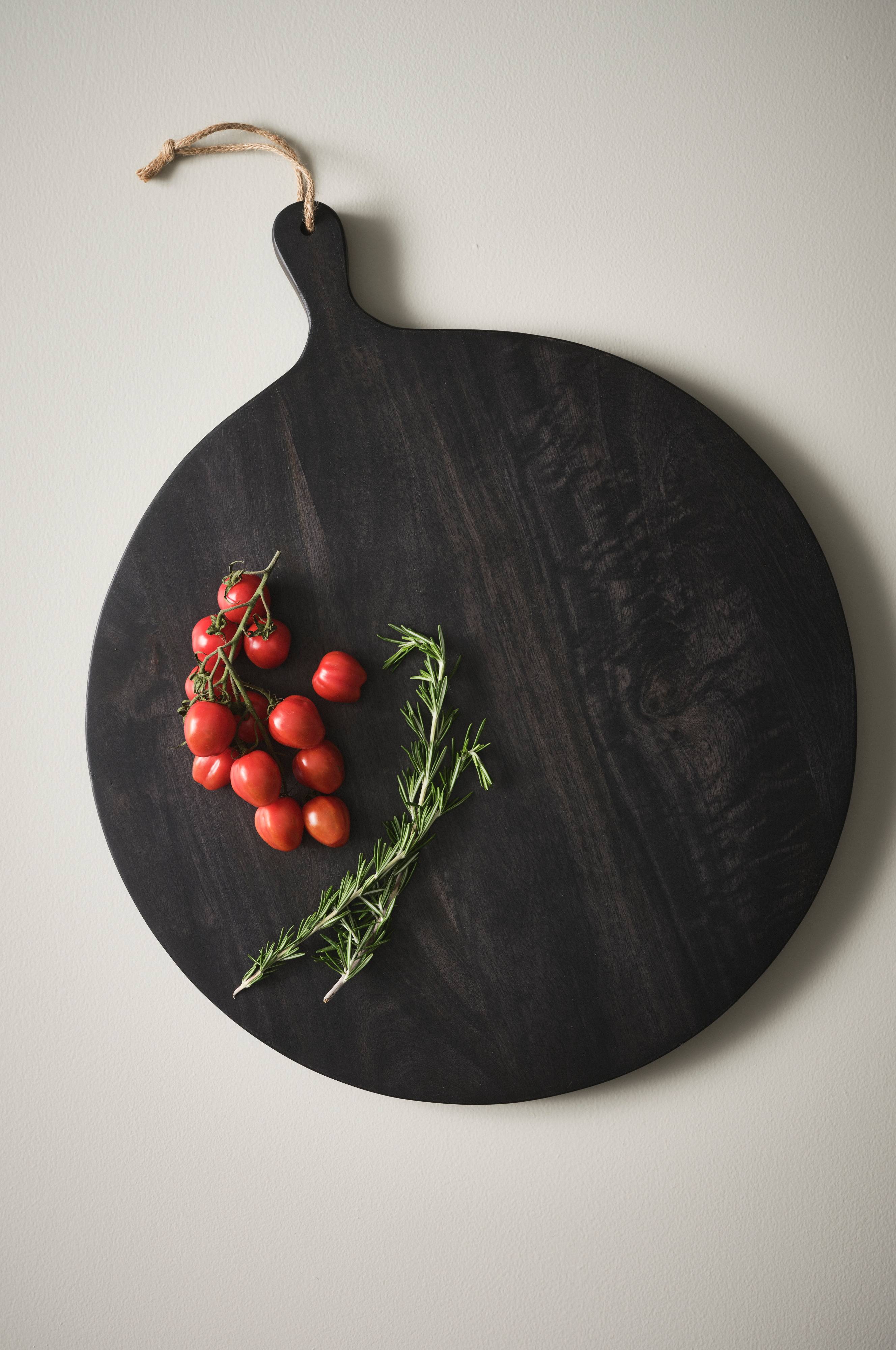 Deska do krojenia wykonana z drewna mango. Drewno jest materiałem naturalnym, a jego różnorodność sprawia, że każda deska jest wyjątkowa, różnice w usłojeniu są szczególnie widoczne, kiedy powierzchnia drewna nie została zakonserwowana. Ta okrągła deska odznacza się miękko zaokrąglonymi brzegami, posiada również otwór umożliwiający powieszenie deski na ścianie jako dekorację.