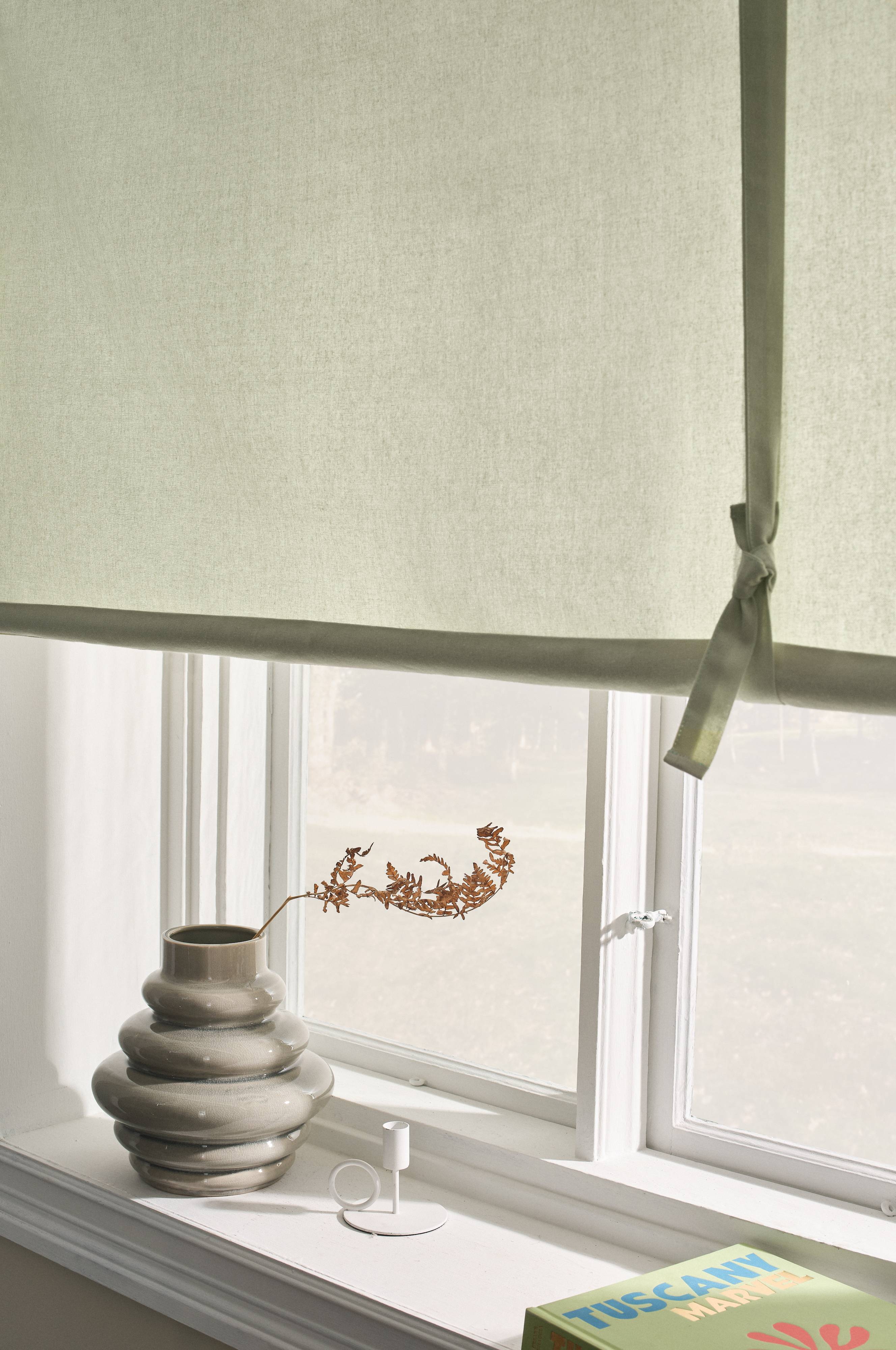 Roleta zwijana wykonana z bawełny. Do zawieszenia na karniszu. Wysokość rolety regulowana jest wiązanymi tasiemkami.