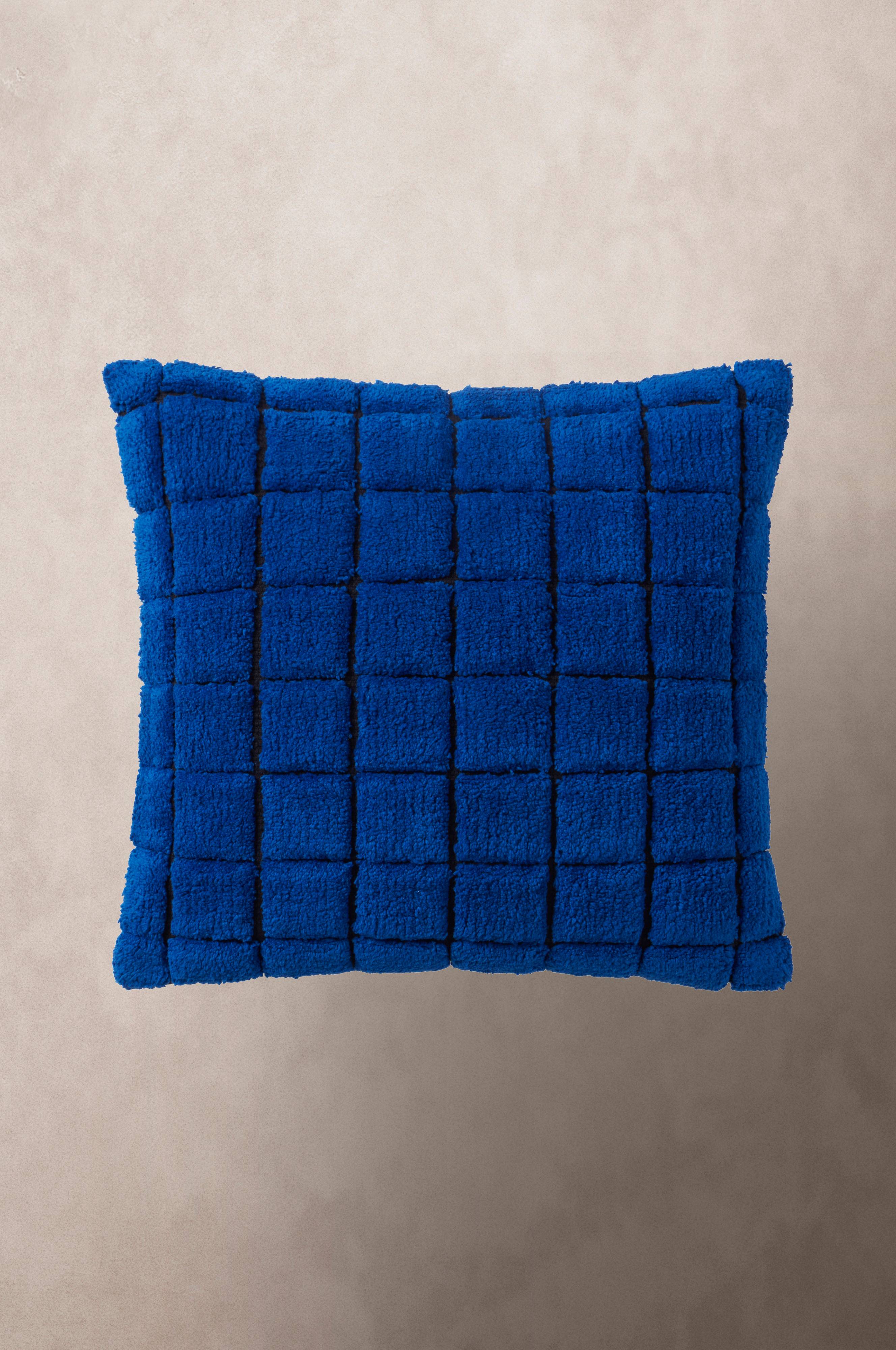 Poszewka dekoracyjna ze wzorem tuftowanych kwadratów na nieco grubszej tkaninie. Miękkie, krótkie włosie tworzy wspaniały efekt. Tył poszewki wykonano z gładkiego, tkanego materiału i wszyto w niego zamek błyskawiczny. Gramatura tkaniny 440 g/m².