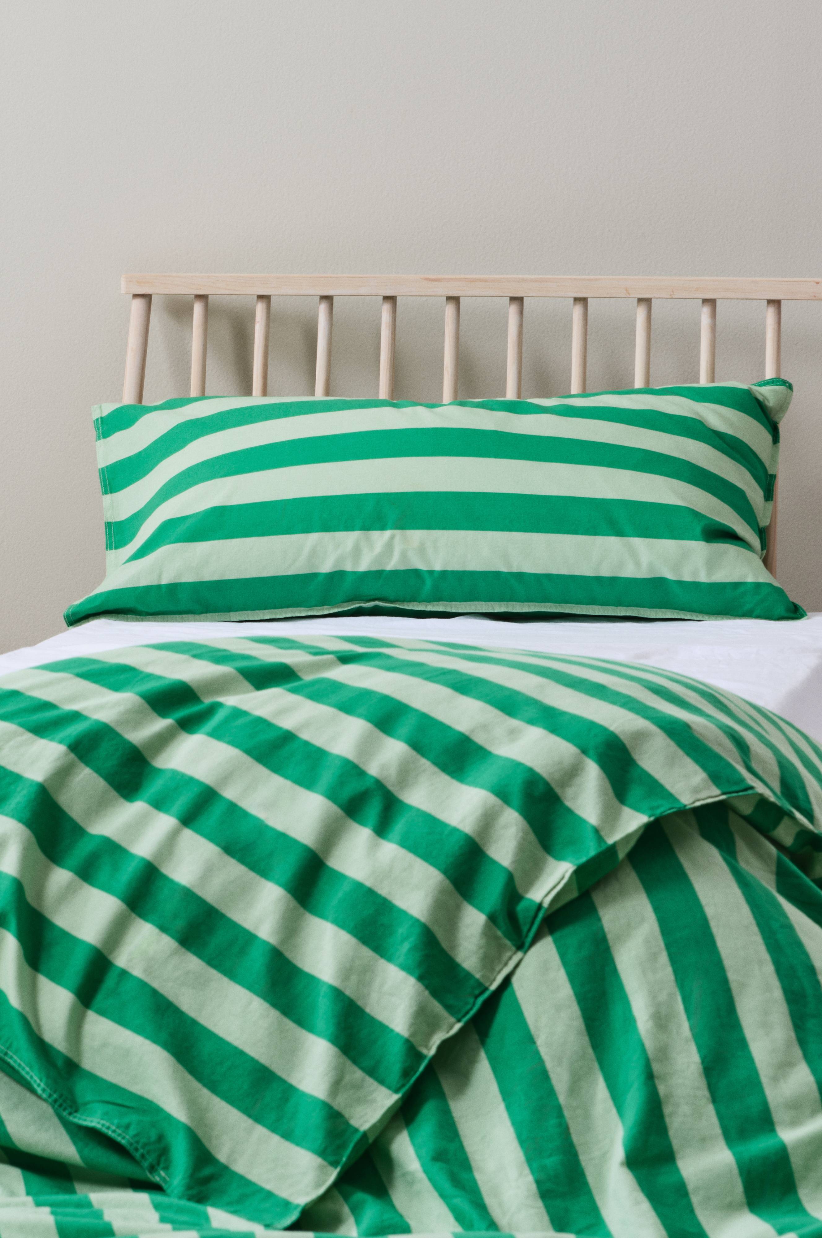 Poszewka na poduszkę z ekologicznej bawełny. Komplet nadaje się do łóżeczek dla niemowląt. Nadrukowany wzór grubych pasów zawsze ma w sobie coś świeżego, nawet dla najmłodszych, a ekologiczna bawełna jest chłodna i przyjemna dla skóry. Ponadto poszewka została poddana praniu przemysłowemu, co oznacza, że po uszyciu była wyprana, dzięki czemu zyskała na miękkości i wyglądzie. Biegnący wokół podwójny szew nadaje całości ekskluzywnego charakteru. Gęstość splotu materiału wynosi 144 TC. (Gęstość splotu materiału oznacza ilość przeplecionych ze sobą nici, thread count, na cal kwadratowy materiału. Im wyższa gęstość tym lepsza jakość).