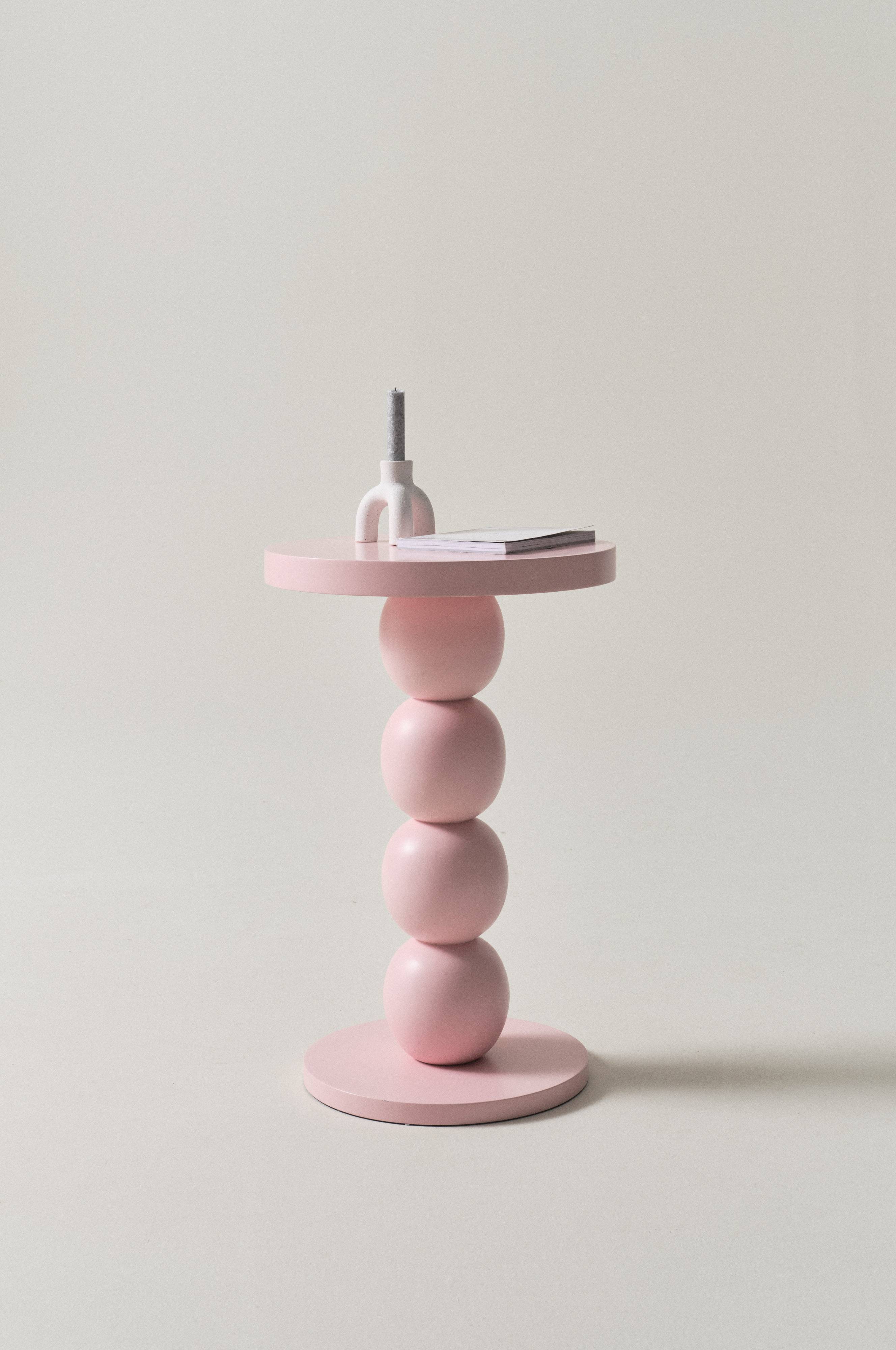 Okrągły stolik z litego drewna mango pomalowanego w żywe kolory. Ten niewielki stolik na kolumnie jest pomalowany na jeden kolor i odznacza się kształtem, który przywoła uśmiech u wielu, stolik ten ma po prostu wesoły kształt i kolor.