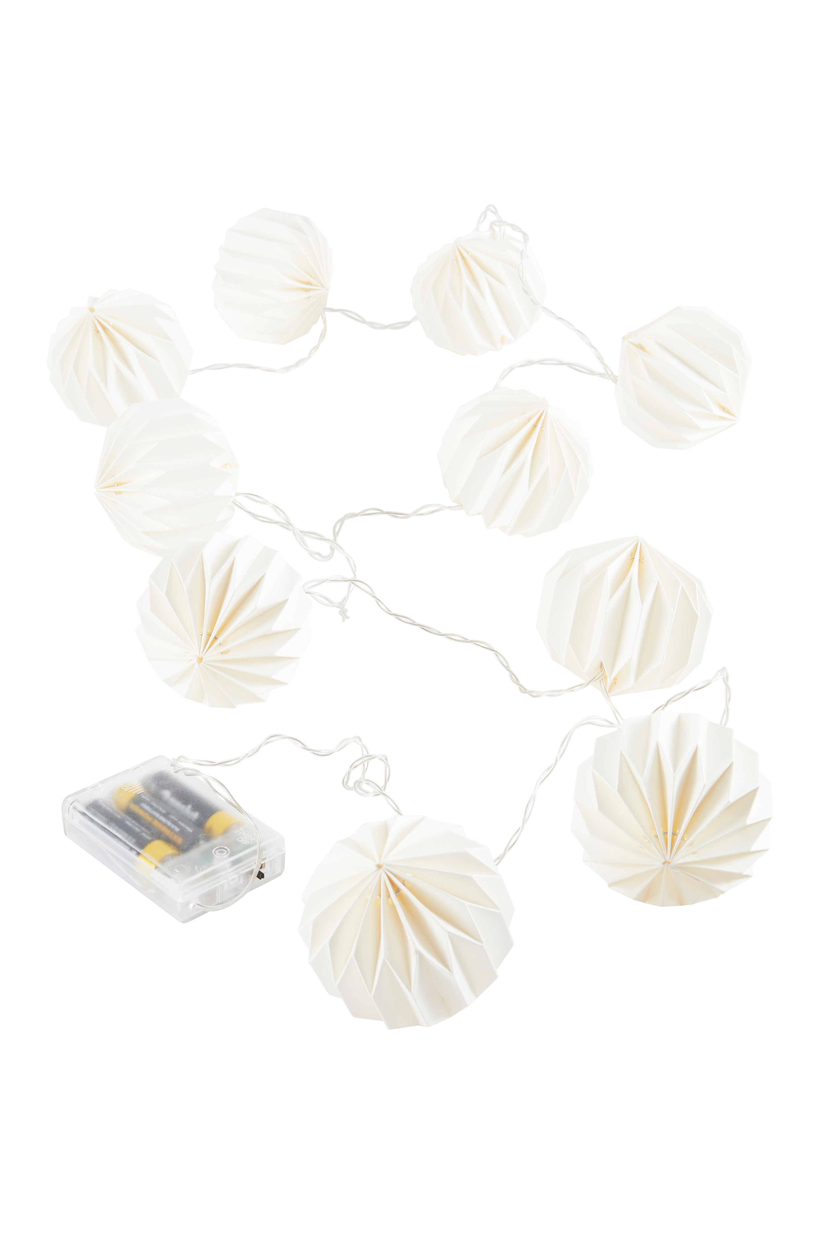 Zasilana bateriami girlanda z 10 kulami z papieru i lampkami LED, które roztaczają nastrojowe światło. Girlanda sprawdza się idealne na co dzień i od święta i roztacza przytulny blask w miejscach, gdzie nie masz dostępu do gniazdka. Do użytku w pomieszczeniach. Zasilanie: 3 baterie AA. Baterie sprzedawane osobno.