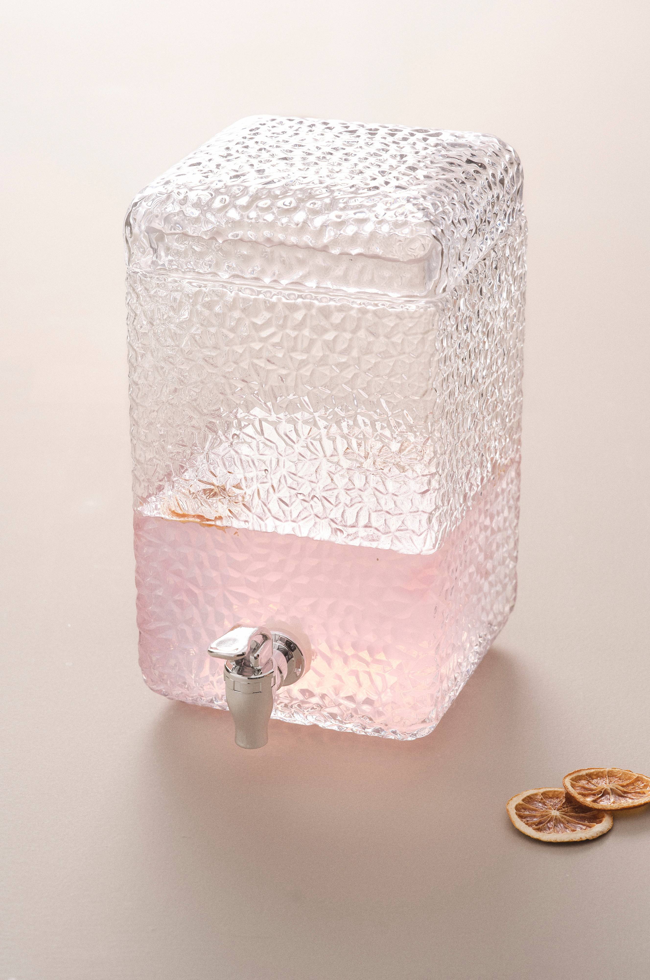 Szklany pojemnik z kranem, idealny na przyjęcia, zarówno te urządzane w domu jak i na zewnątrz. FENNA wykonano z cudownego szkła bąbelkowego, dzięki czemu napoje pozostają chłodne i świeże. Pojemnik napełnia się przez podniesienie pokrywki. Napełniony napojem pojemnik można przechowywać w lodówce.