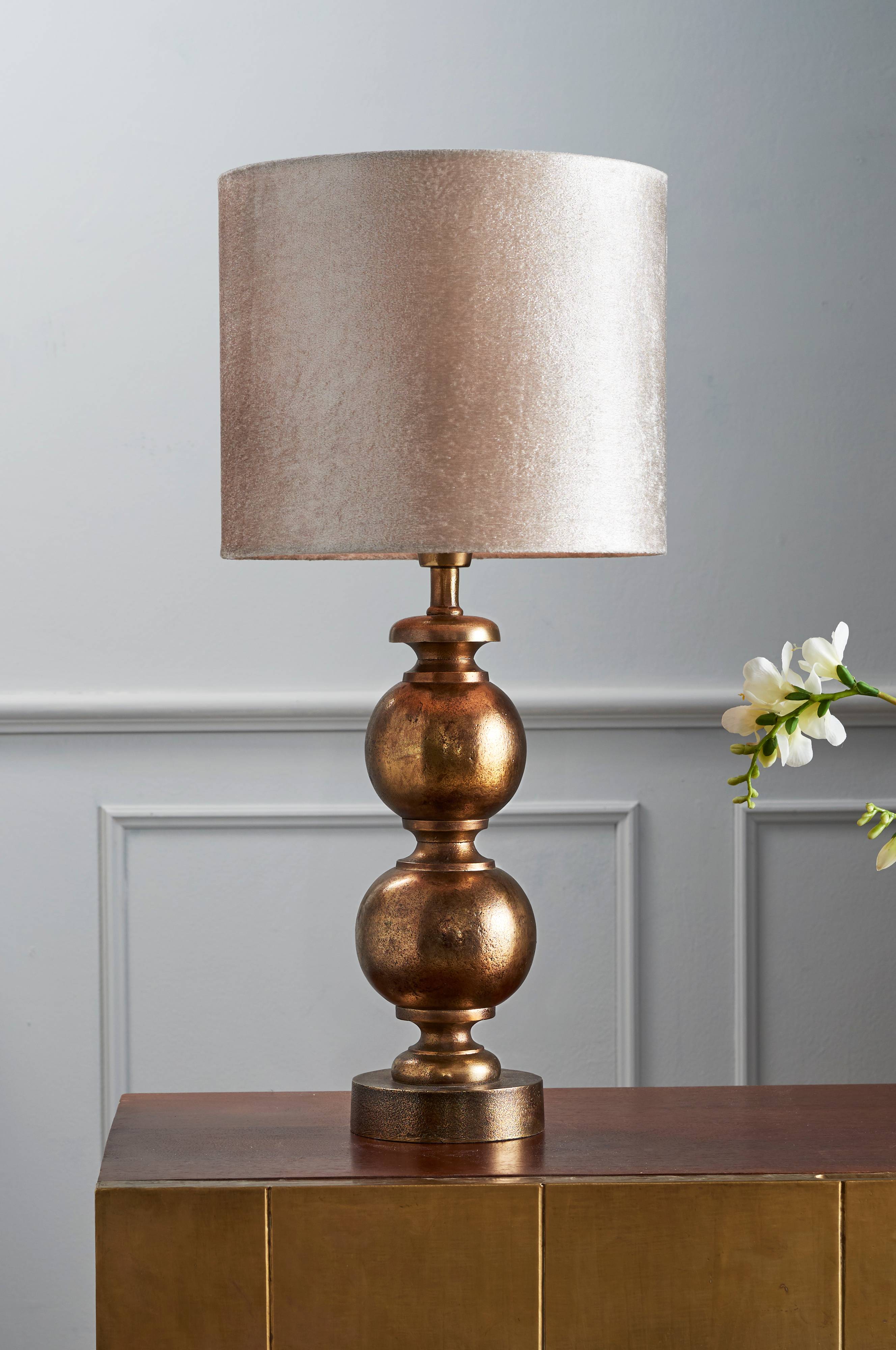 Lampa stołowa ze stopką w kolorze antycznego metalu i kloszem z aksamitu z wiskozy. Czarny przewód w tekstylnym oplocie, z wyłącznikiem, długość przewodu 150 cm.