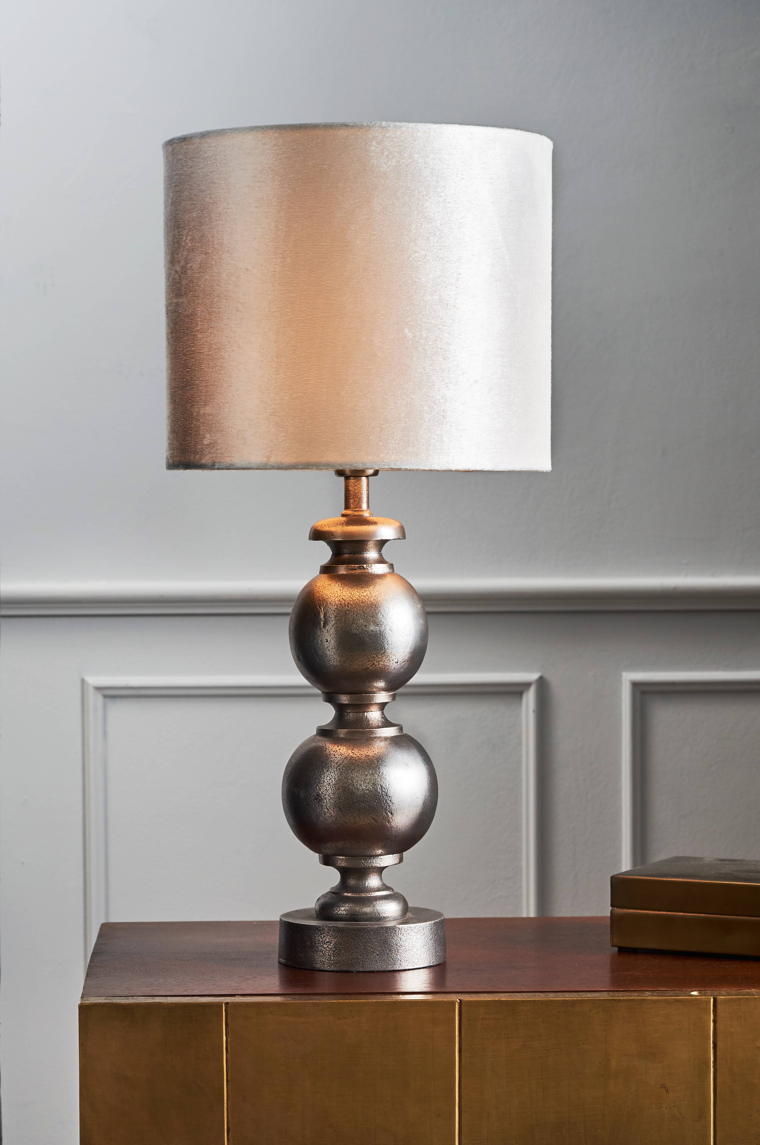 Lampa stołowa ze stopką w kolorze antycznego metalu i kloszem z aksamitu z wiskozy. Czarny przewód w tekstylnym oplocie, z wyłącznikiem, długość przewodu 150 cm.