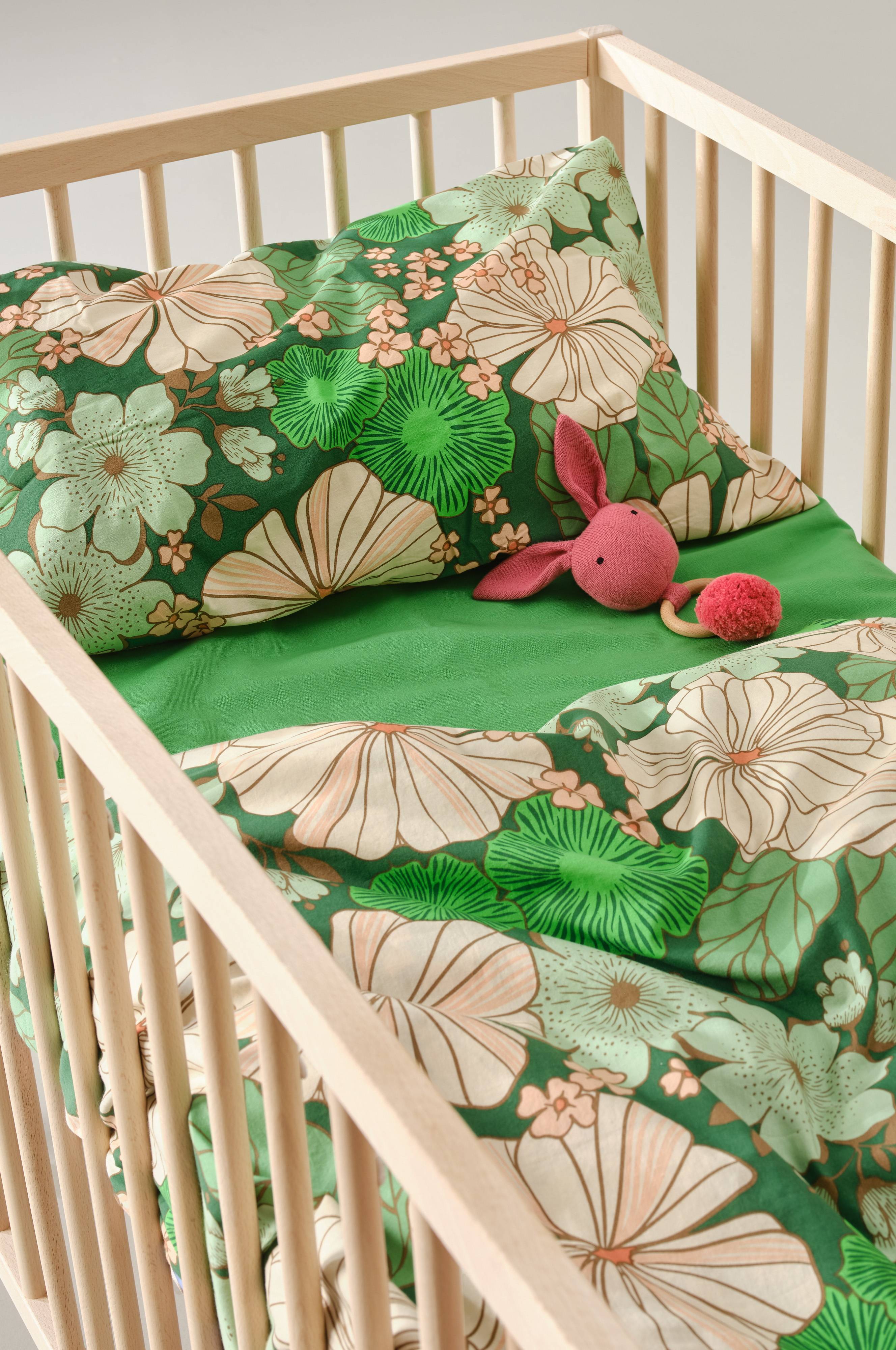 Dwuczęściowy zestaw z poszwą na kołdrę i poszewką na poduszkę z cienkiej, ciasno tkanej bawełny. Tkanina ma piękny kwiatowy wzór nadrukowany w pięknej gamie kolorów. Jest również prany enzymatycznie, co nadaje mu przyjemną miękkość i lekko zużyty wygląd. Zestaw nadaje się do łóżeczek dziecięcych.