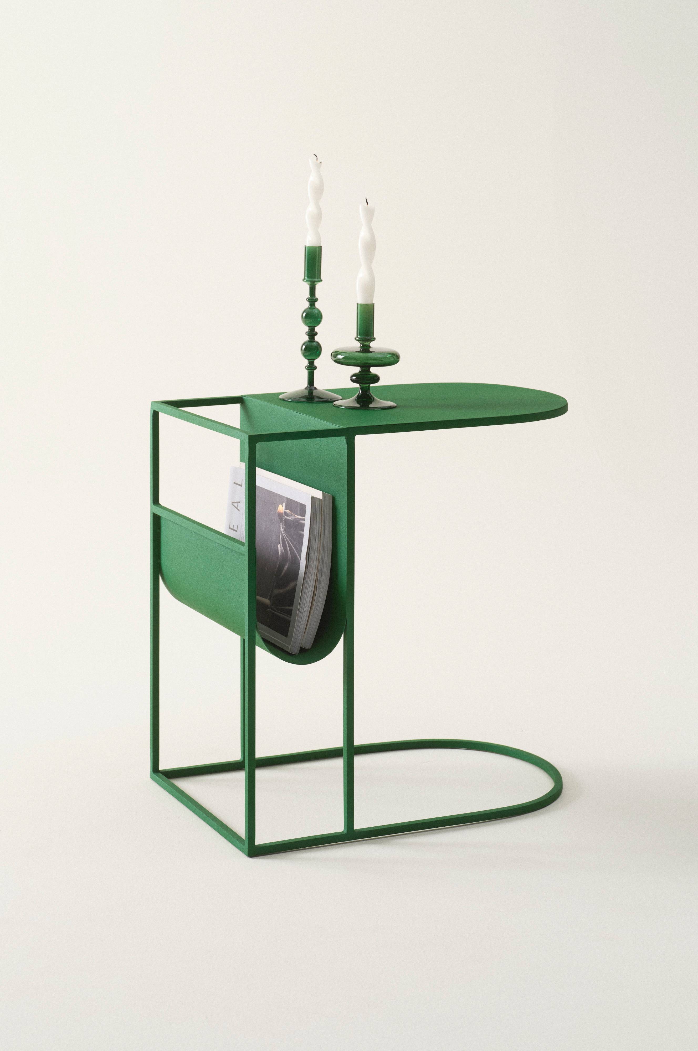 Stolik wykonany z żelaza z matową powierzchnią i delikatną fakturą. Ma intrygujący kształt - jeden bok jest zaokrąglony, w drugi wbudowano kosz na czasopisma. FLIMS powstał z myślą o tych, którzy chcą jednocześnie relaksować się przy dobrej kawie i czytać gazetę w swoim ulubionym fotelu.