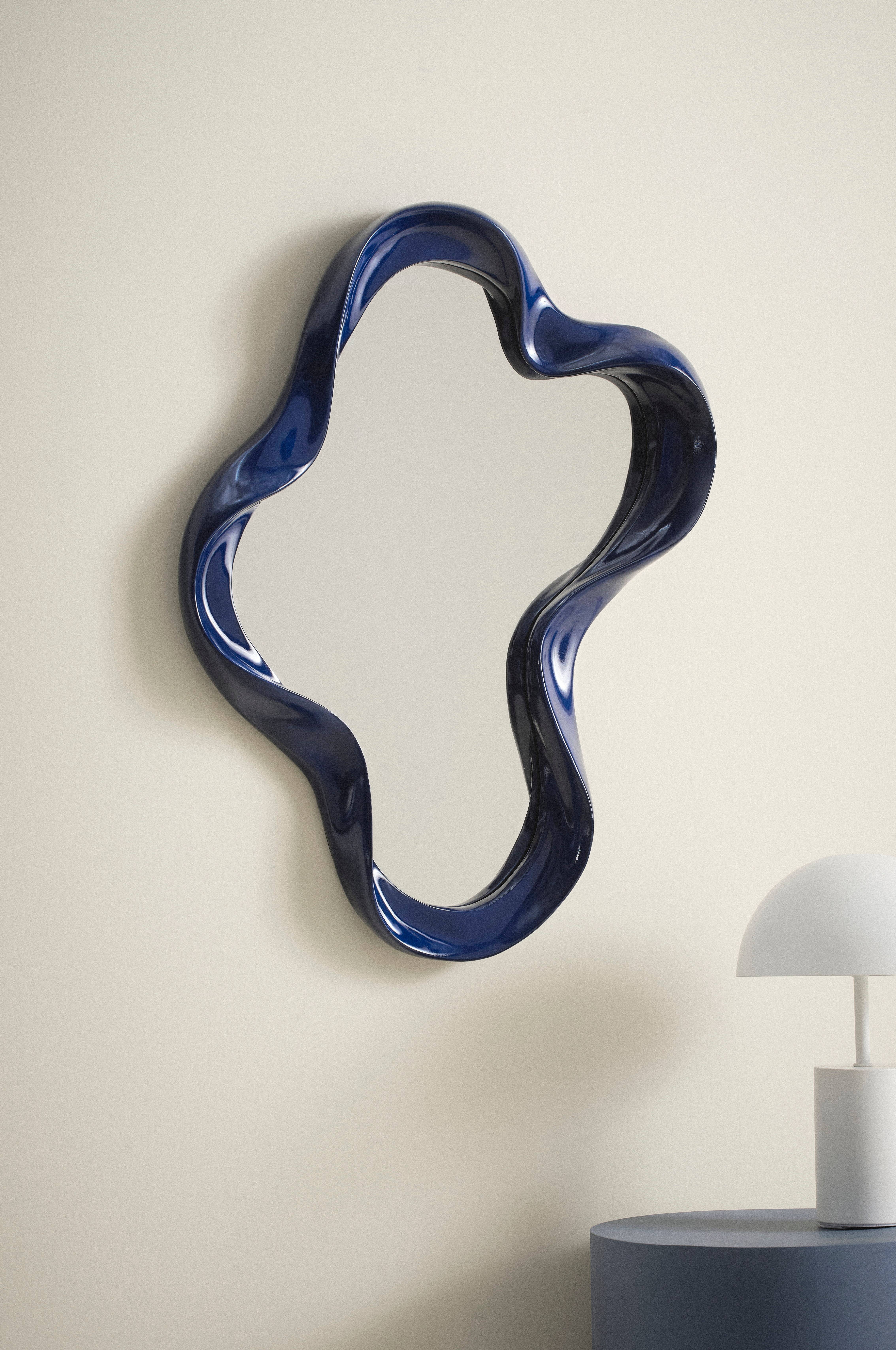 Ręcznie wykonane lustro o nieregularnym, opływowym kształcie i kolorowej ramie, która dodaje mu charakteru. Lustro zawiesza się na ścianie, wykorzystując otwory do zawieszenia umieszczone z tyłu. Wspaniałe ręczne wykonanie sprawia, że każde lustro jest wyjątkowe.