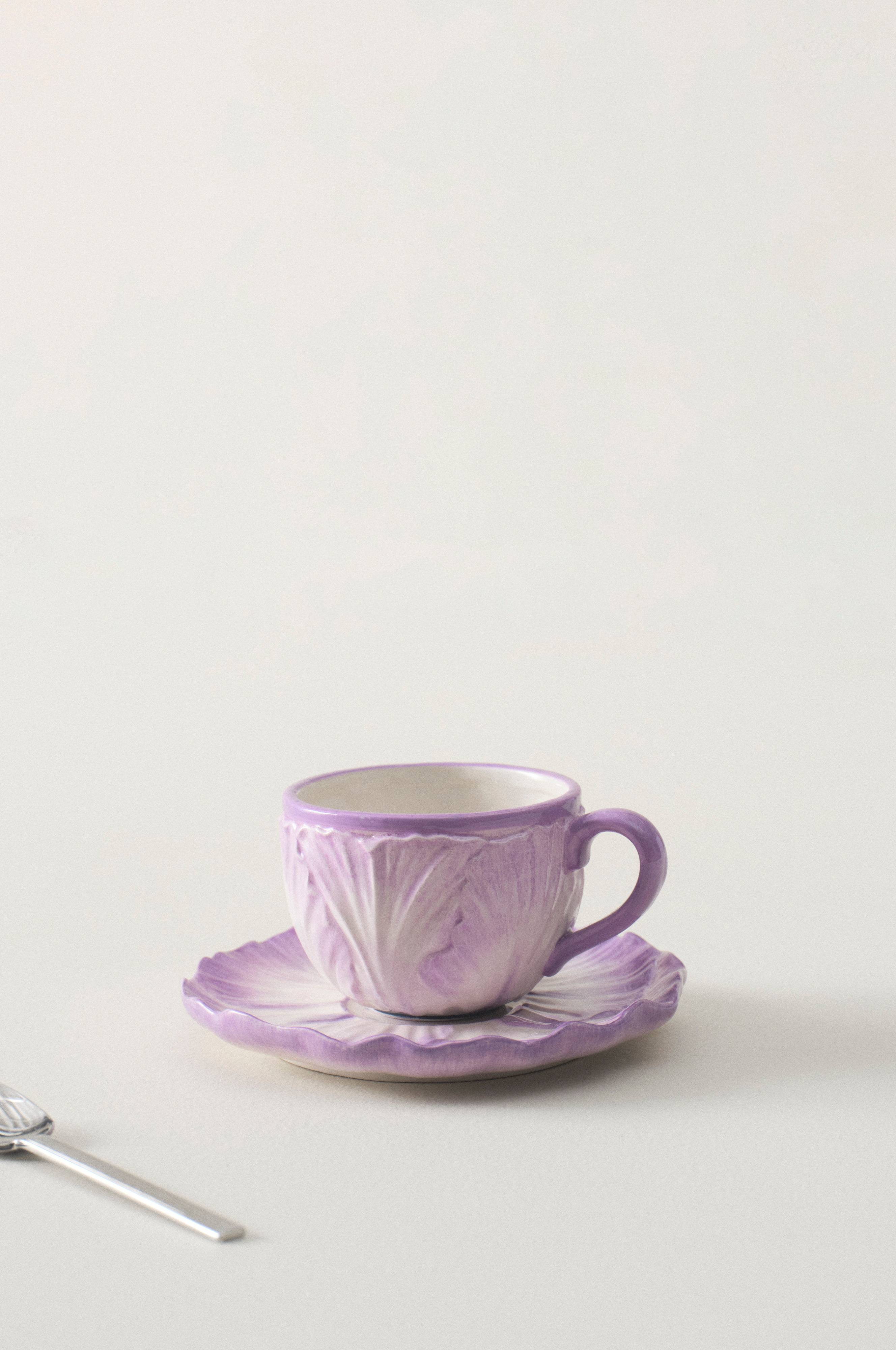 Komplet składający się z kubka i spodka. Komplet został wykonany ręcznie z porcelany dolomitowej, a zarówno jego kształt, jak i kolor, przywodzą na myśl rozkwitający fiołek. Błyszcząca glazura została nałożona ręcznie, dzięki czemu każdy egzemplarz jest wyjątkowy. Dzięki tym letnim kubkom ze spodkami stworzysz urocze nakrycie.