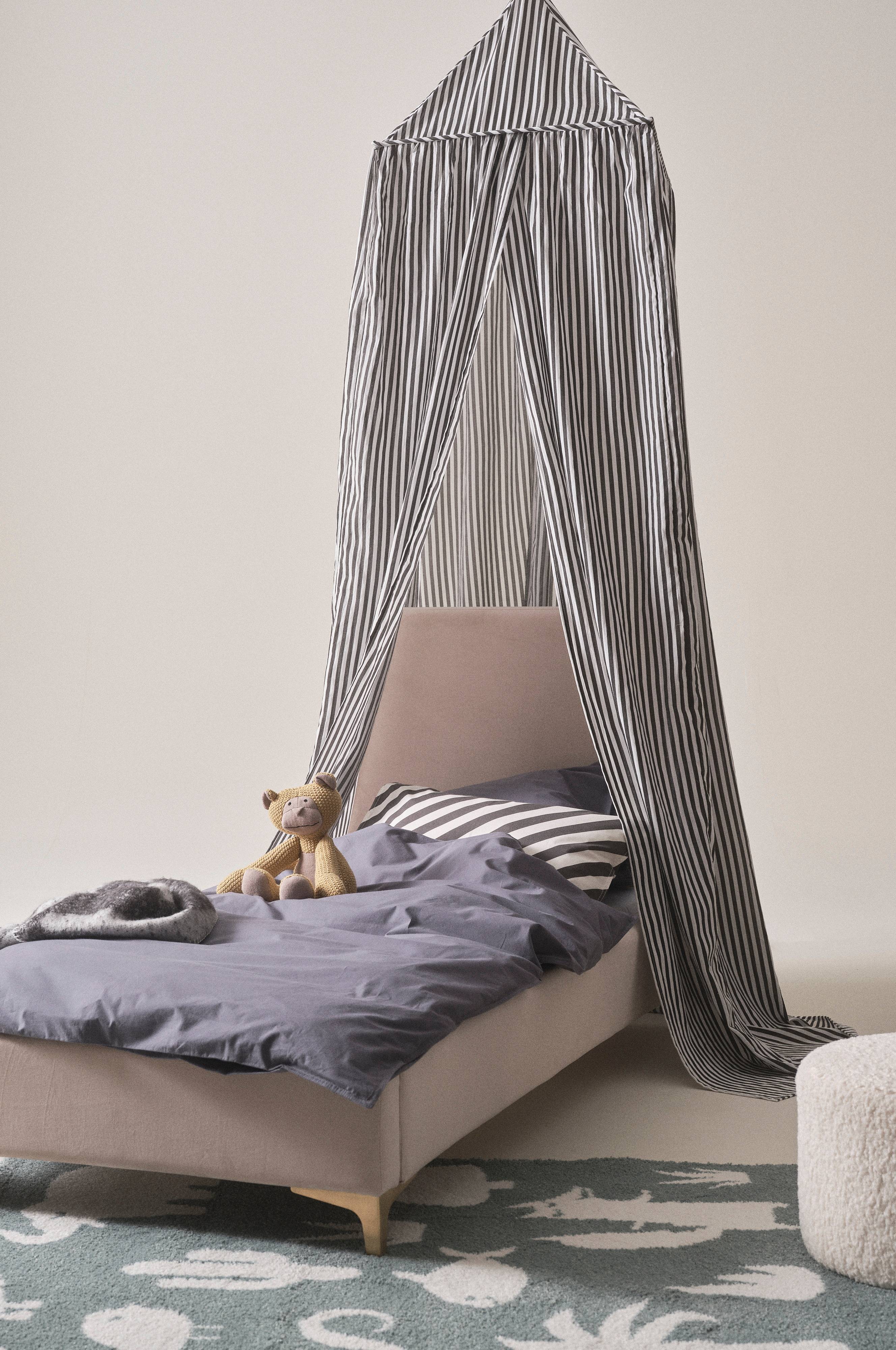 Baldachim do łóżka z elastycznej tkaniny poliestrowo-bawełnianej z nadrukowanym wzorem w paski. Baldachim jest kwadratowy u góry i otwarty z przodu. Baldachim nad łóżkiem dziecięcym tworzy przytulną atmosferę, dzięki czemu kładzenie się do łóżka może być nieco bardziej przytulne. Wzór FRANNY jest dostępny w wielu różnych częściach, dzięki czemu możesz udekorować pokój dziecięcy motywem w paski.