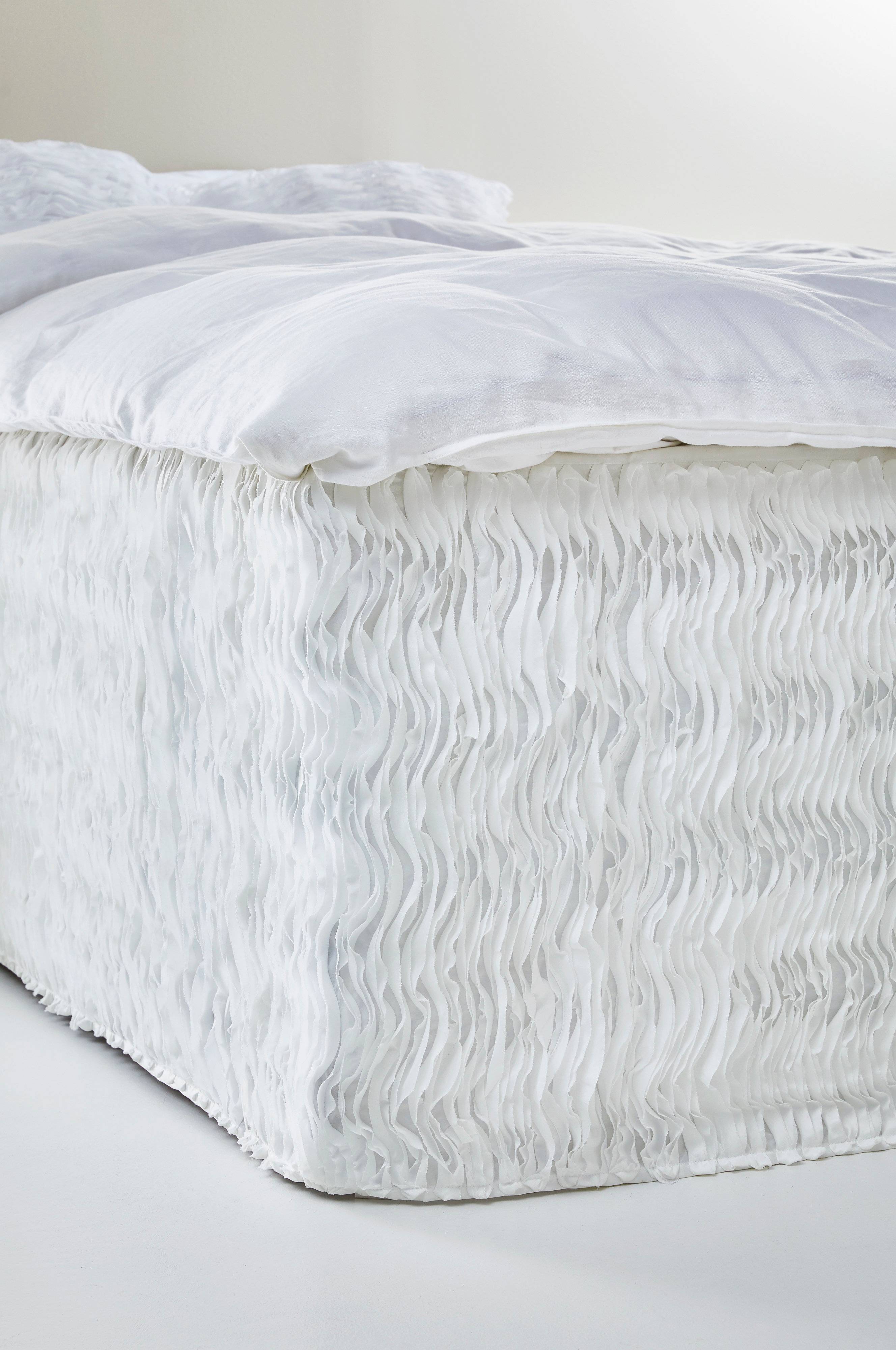 Jednokolorowy lambrekin z poliestru. Narzuta FRILLY z ręcznie uszytymi dekoracyjnymi falbankami nada posałniu romantyczny charakter.