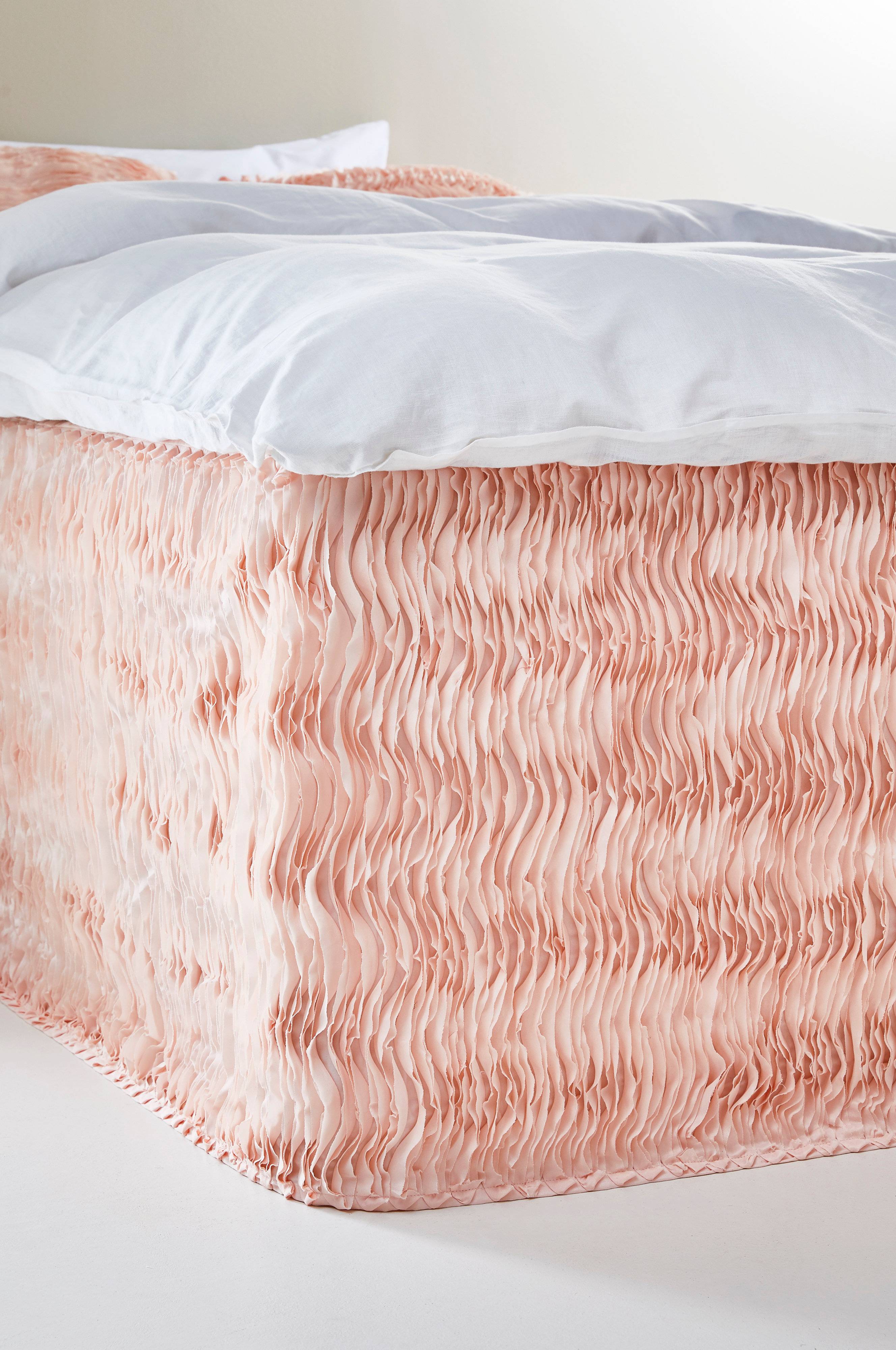 Jednokolorowy lambrekin z poliestru. Narzuta FRILLY z ręcznie uszytymi dekoracyjnymi falbankami nada posałniu romantyczny charakter.
