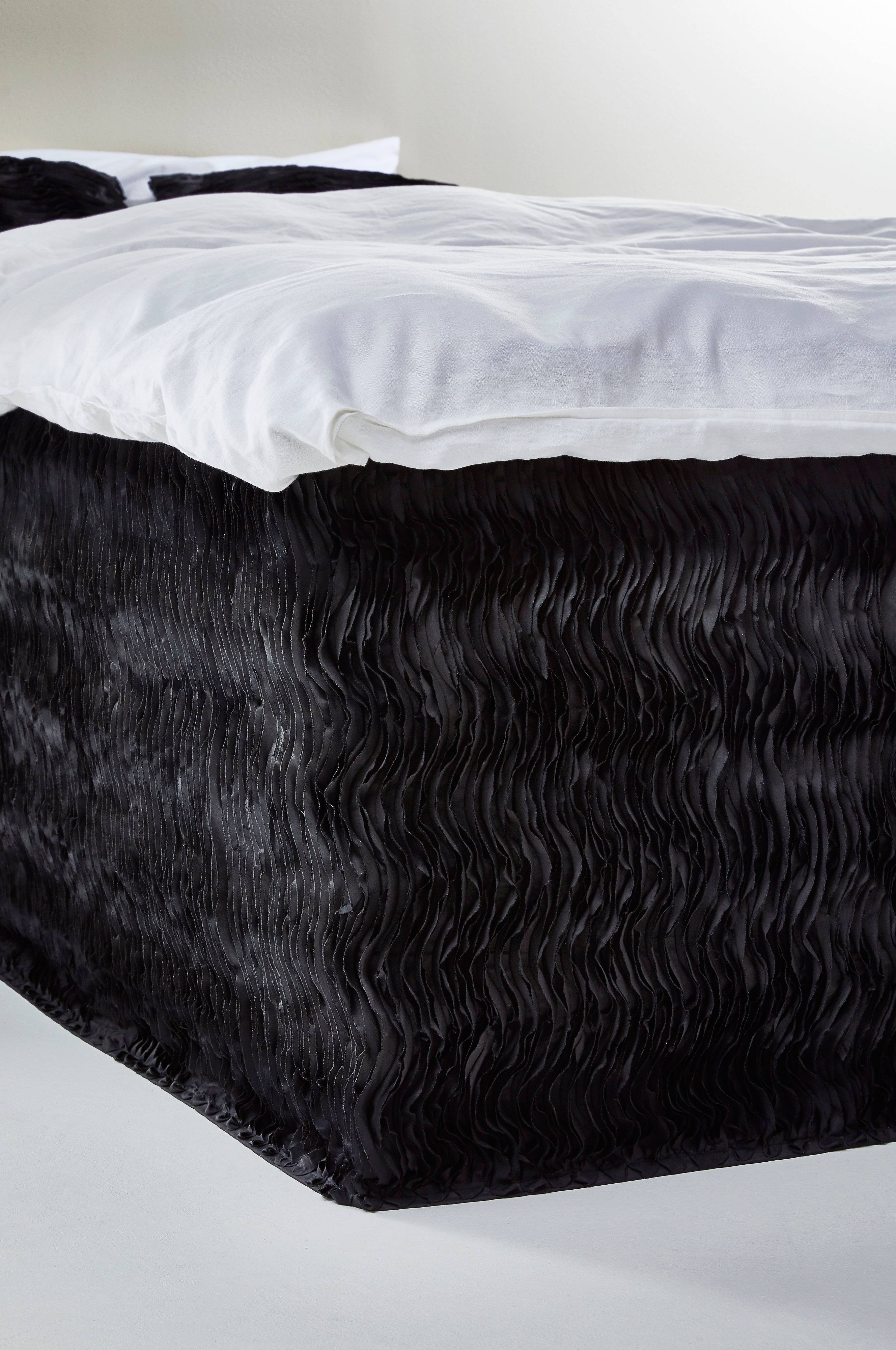 Jednokolorowy lambrekin z poliestru. Narzuta FRILLY z ręcznie uszytymi dekoracyjnymi falbankami nada posałniu romantyczny charakter.