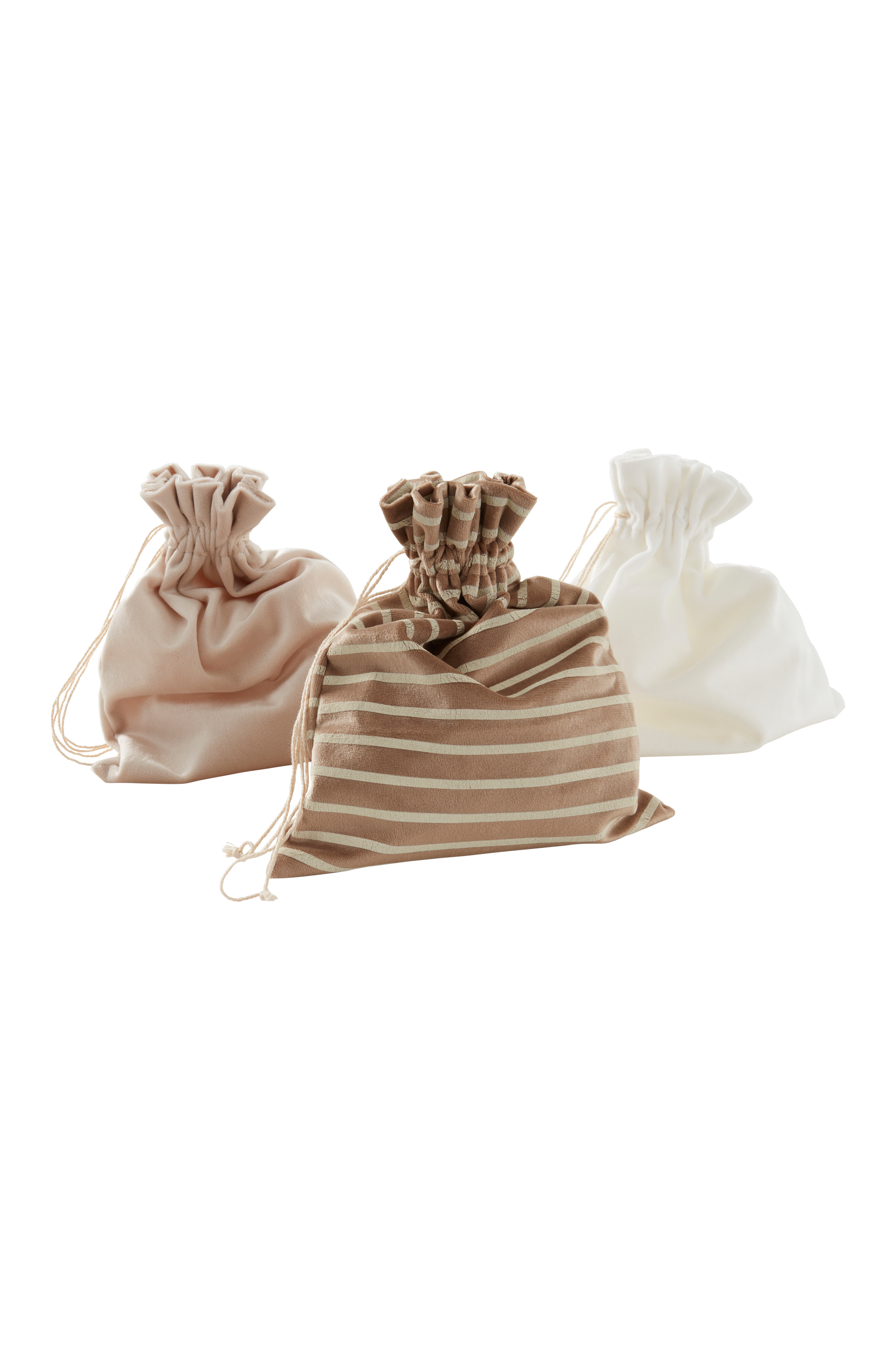 3 torebki na prezenty wykonane z poliestrowego aksamitu. Trzy aksamitne woreczki, z których każdy jest inny - jeden jest w paski, a dwa są gładkie i w różnych kolorach. Woreczki zamykane są za pomocą ściąganych sznureczków. Są idealne do przechowywania drobiazgów i tak piękne, że z powodzeniem mogą zastąpić papier przy pakowaniu prezentów.