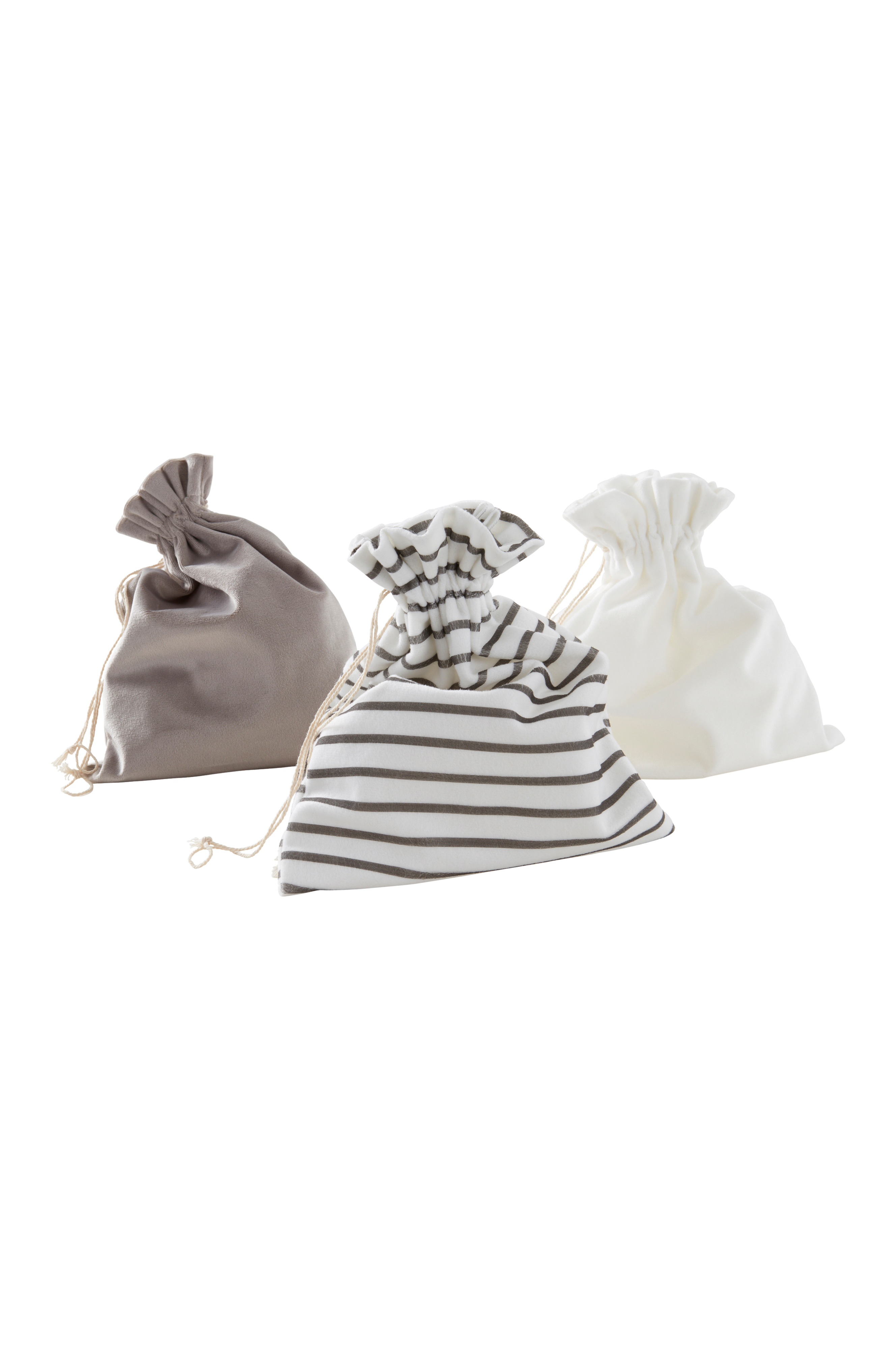3 torebki na prezenty wykonane z poliestrowego aksamitu. Trzy aksamitne woreczki, z których każdy jest inny - jeden jest w paski, a dwa są gładkie i w różnych kolorach. Woreczki zamykane są za pomocą ściąganych sznureczków. Są idealne do przechowywania drobiazgów i tak piękne, że z powodzeniem mogą zastąpić papier przy pakowaniu prezentów.