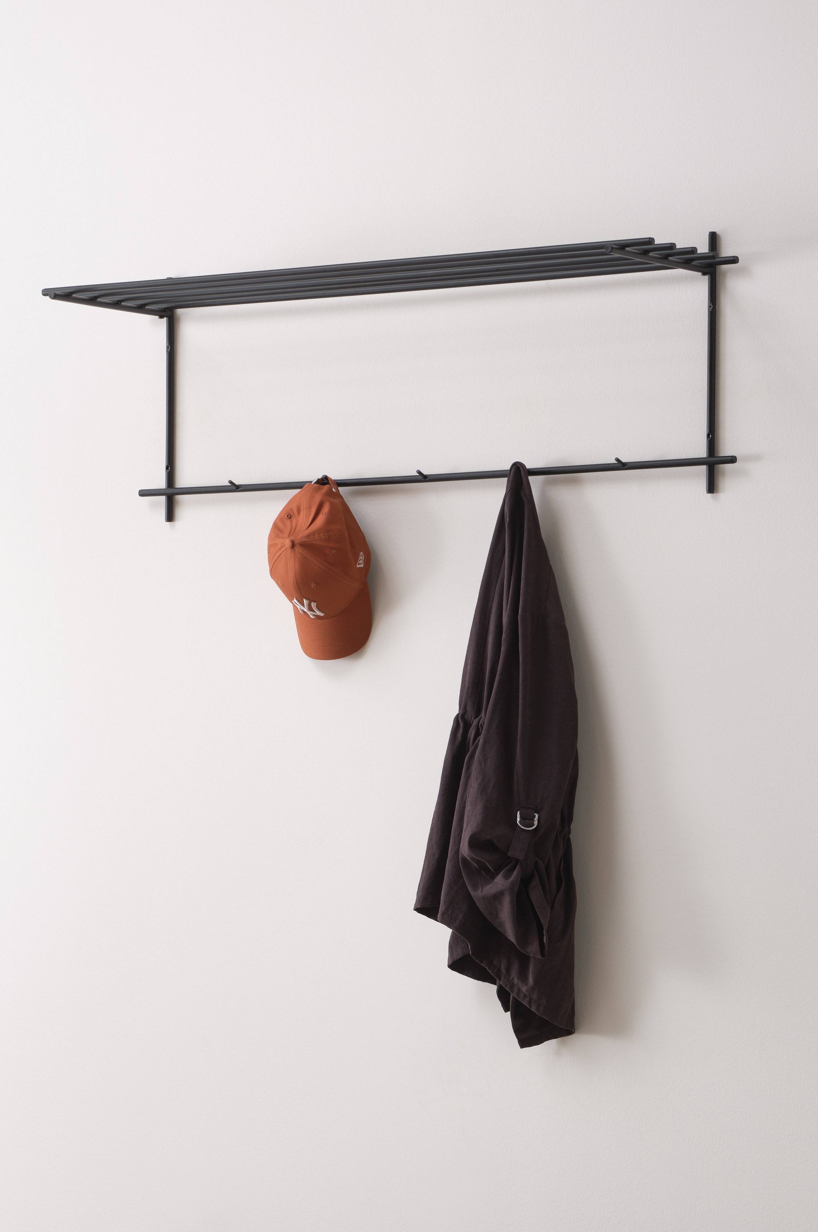 GLAZE to seria minimalistycznych mebli, które zapewnią stylowe przechowywanie w przedpokoju. Półka na kapelusze wykonana jest z żelaznych rurek pomalowanych na czarno metodą proszkową. Szafka posiada pięć gałek, półeczkę oraz drążek na wieszaki z przodu. Wieszaki na ubrania sprzedawane są osobno.