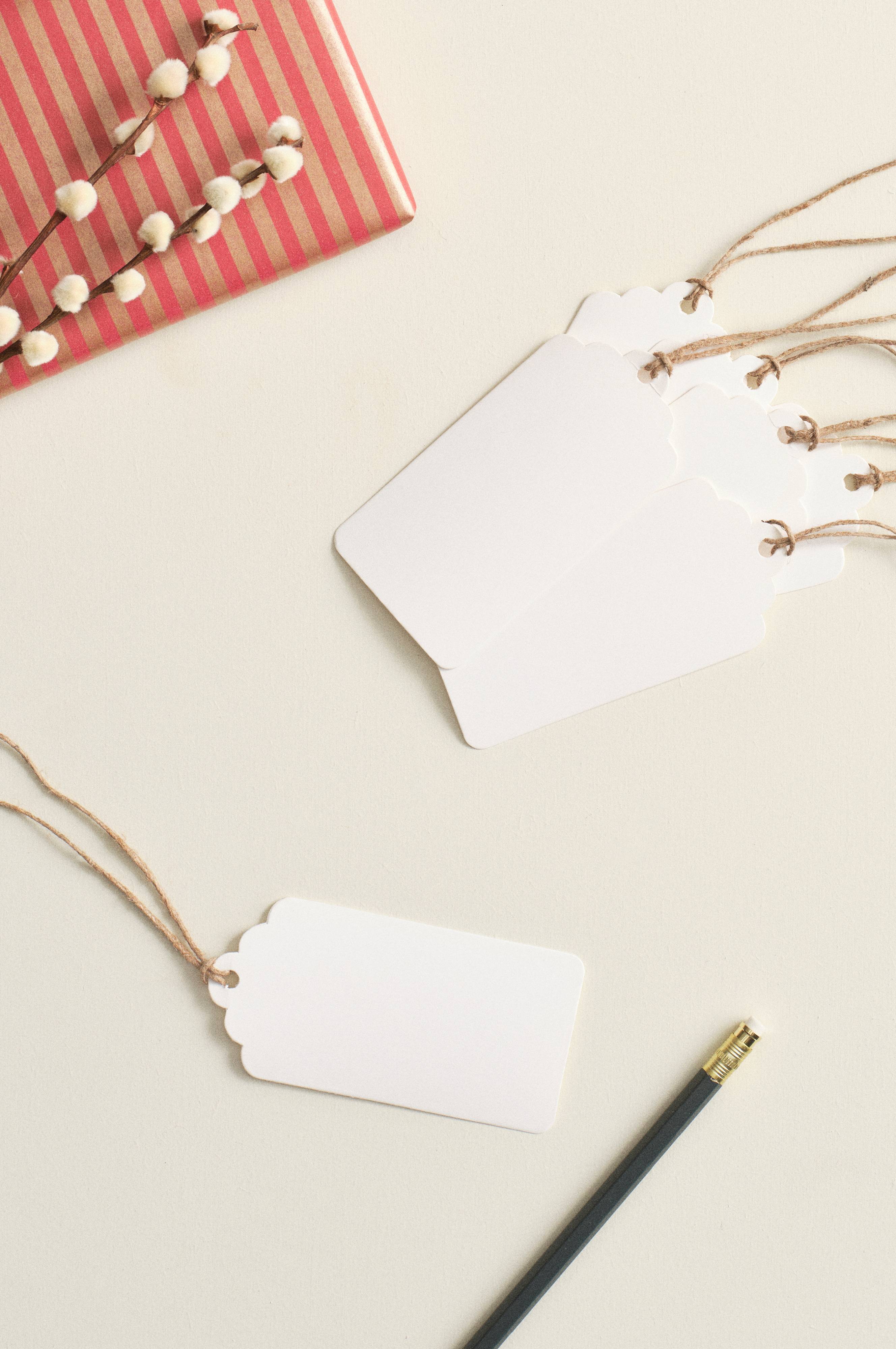 10 bilecików wykonanych z papieru pakowego z certyfikatem FSC. Bileciki mają wzmocniony otwór na jednej z krawędzi, przez który przewleczony jest sznurek do zawieszania.