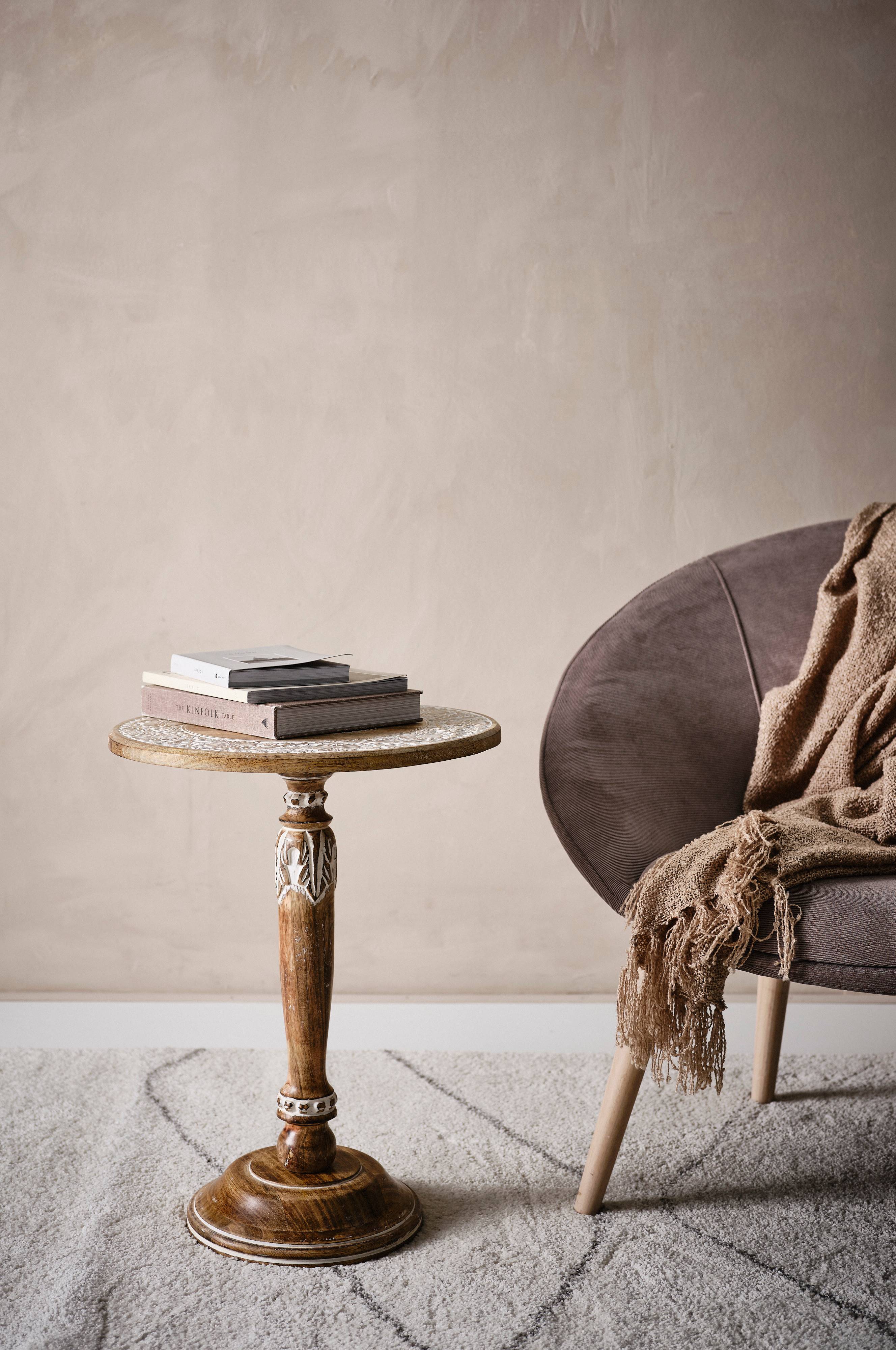 Opis: Okrągły drewniany stolik z wyrzeźbionym wzorem.
