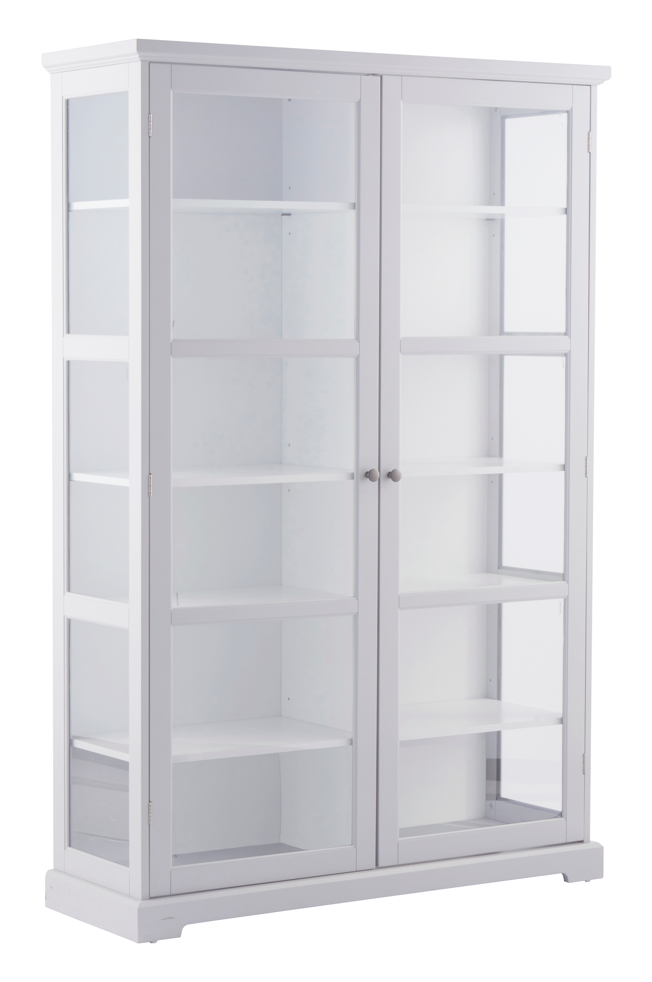 Witryna z MDF z parą drzwiczek ze szkła ze srebrnymi gałkami. Dzięki głębokim półkom zmieścisz w niej naprawdę wiele. Maksymalne obciążenie półki: 20 kg. Produkt dostarczany niezmontowany. Do produktu dołączona jest instrukcja montażu.
