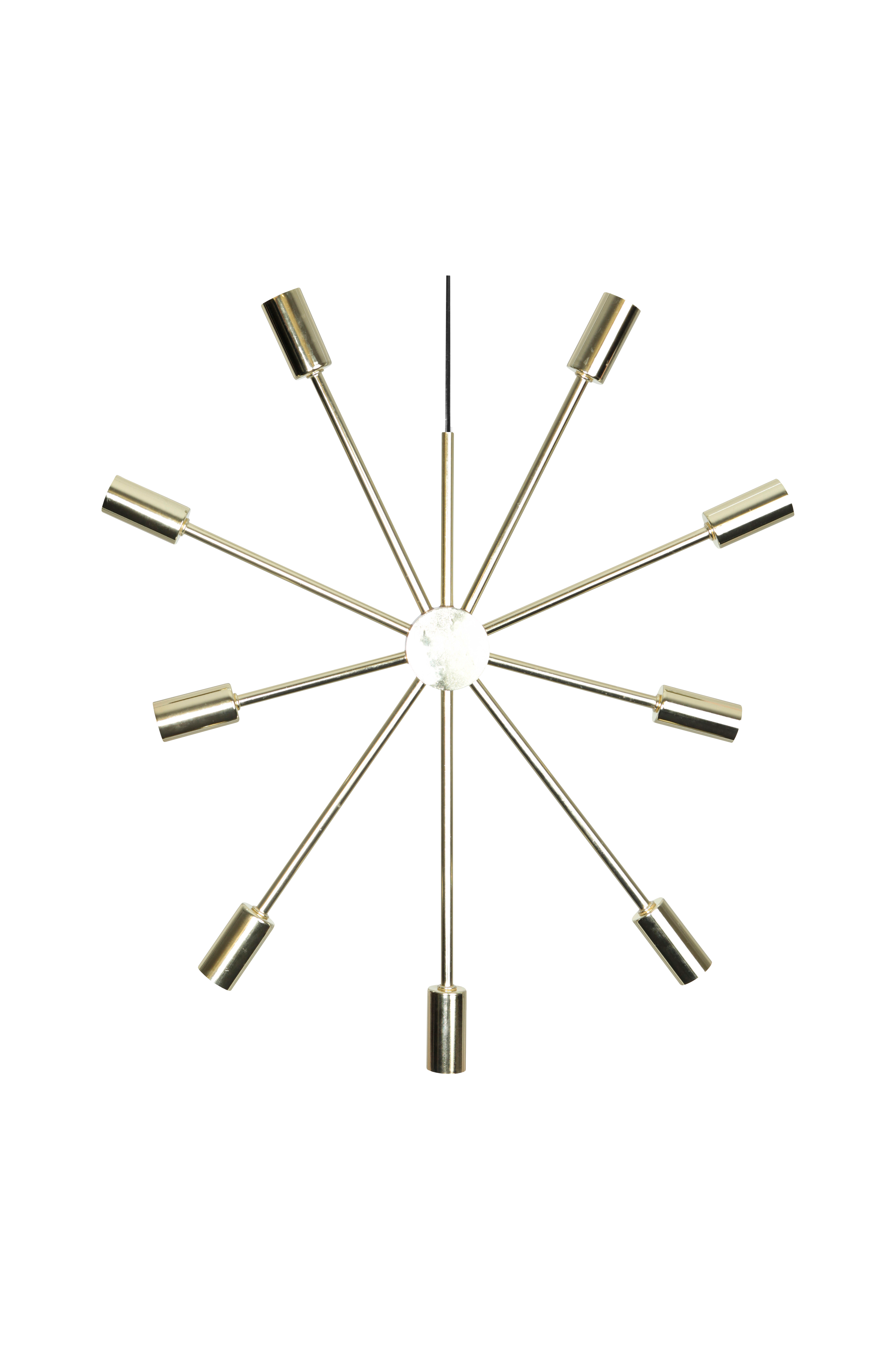 Ekskluzywna, wisząca gwiazda z metalu, z miejscem na 9 żarówek E14. Wysokość 56 cm. Głębokość 3 cm. Szerokość 49,5 cm. Przewód z wyłącznikiem 3,5 m.