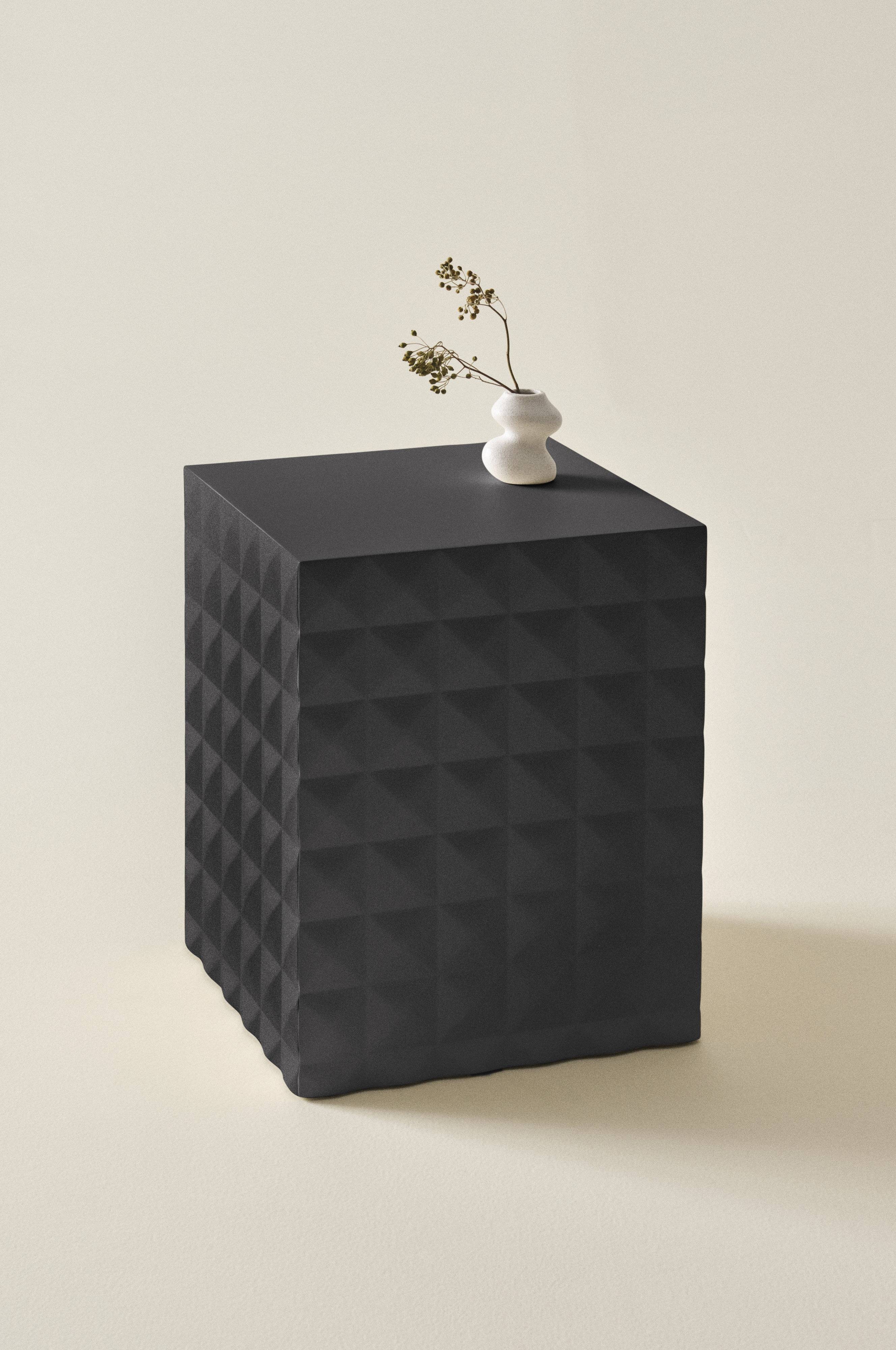 Kwadratowy stolik z płyty MDF oznaczonej certyfikatem FSC i pokrytej matowym lakierem. Gładki blat stolika uzupełniony został bokami ozdobionymi efektownymi figurami geometrycznymi, które dają gustowny efekt 3-D.