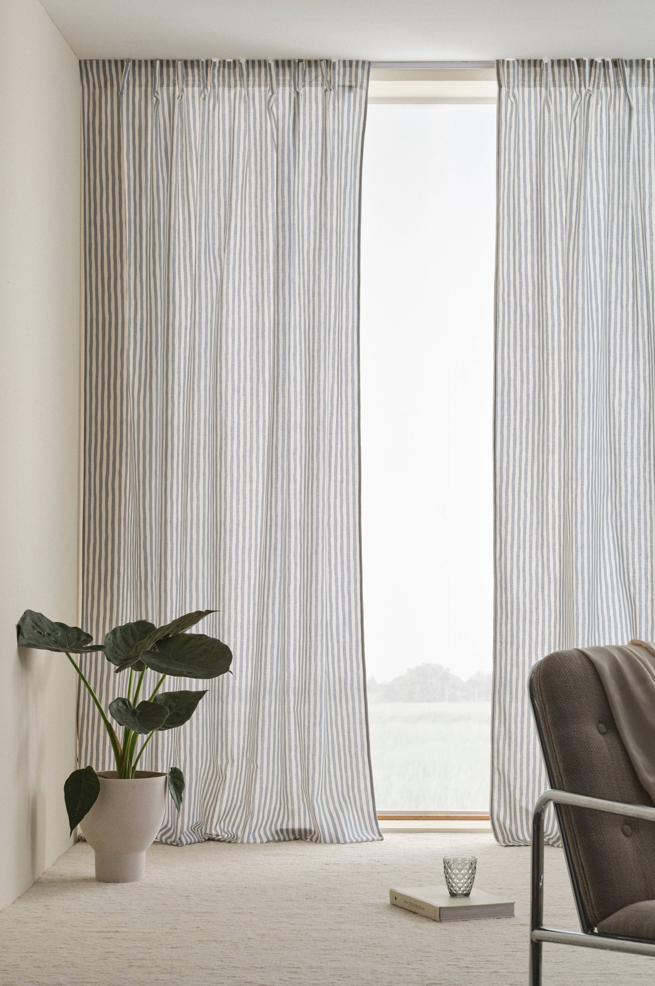Dwie długości zasłon z bawełnianej półpanamy z nadrukowanymi na tkaninie nieco nieregularnymi pasami w dwóch harmonijnych kolorach. Klasyczne paski są zawsze na czasie i pasują do wielu różnych stylów. Zasłony mają wszytą taśmę wielofunkcyjną, dzięki czemu można je zawiesić na haczykach lub przy użyciu tunelu czy krytych szelek.