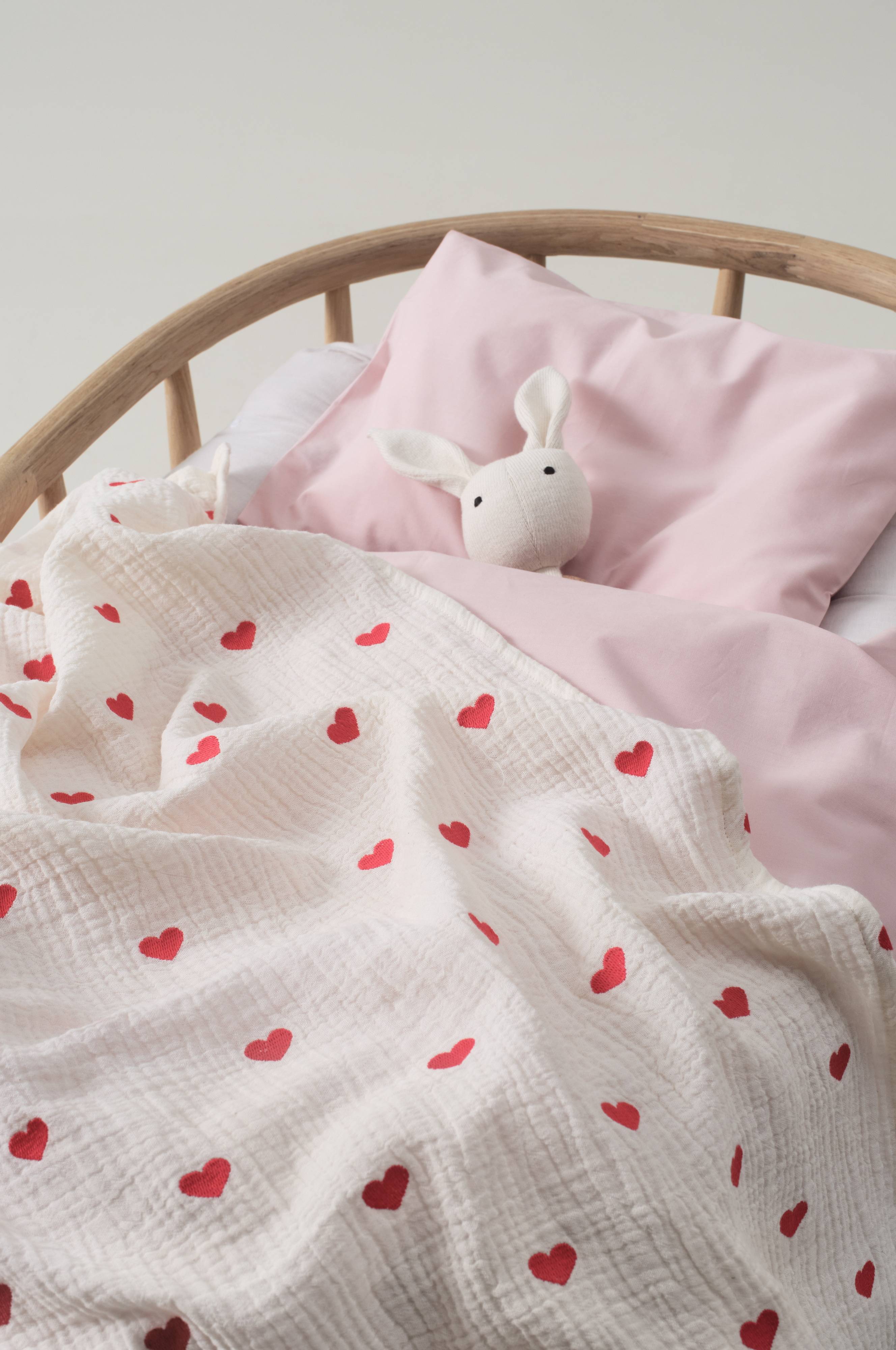 Kocyk wykonany z przyjemnego, ekologicznego, bawełnianego muślinu haftowanego we wzór w serduszka. Muślin jest miękką, delikatną tkaniną, tkaną w dwóch warstwach w taki sposób, aby powstały niewielkie wybrzuszenia, dzięki którym materiał jest miękki i łatwy w utrzymaniu. Nie wymaga prasowania ani maglowania. W tej wygodnej muślinowej tkaninie będzie się przyjemnie spać. Na jednej stronie są serduszka, druga jest gładka. Gęstość splotu materiału wynosi 178 TC. (Gęstość splotu materiału oznacza ilość przeplecionych ze sobą nici, thread count, na cal kwadratowy materiału. Im wyższa gęstość tym lepsza jakość.)