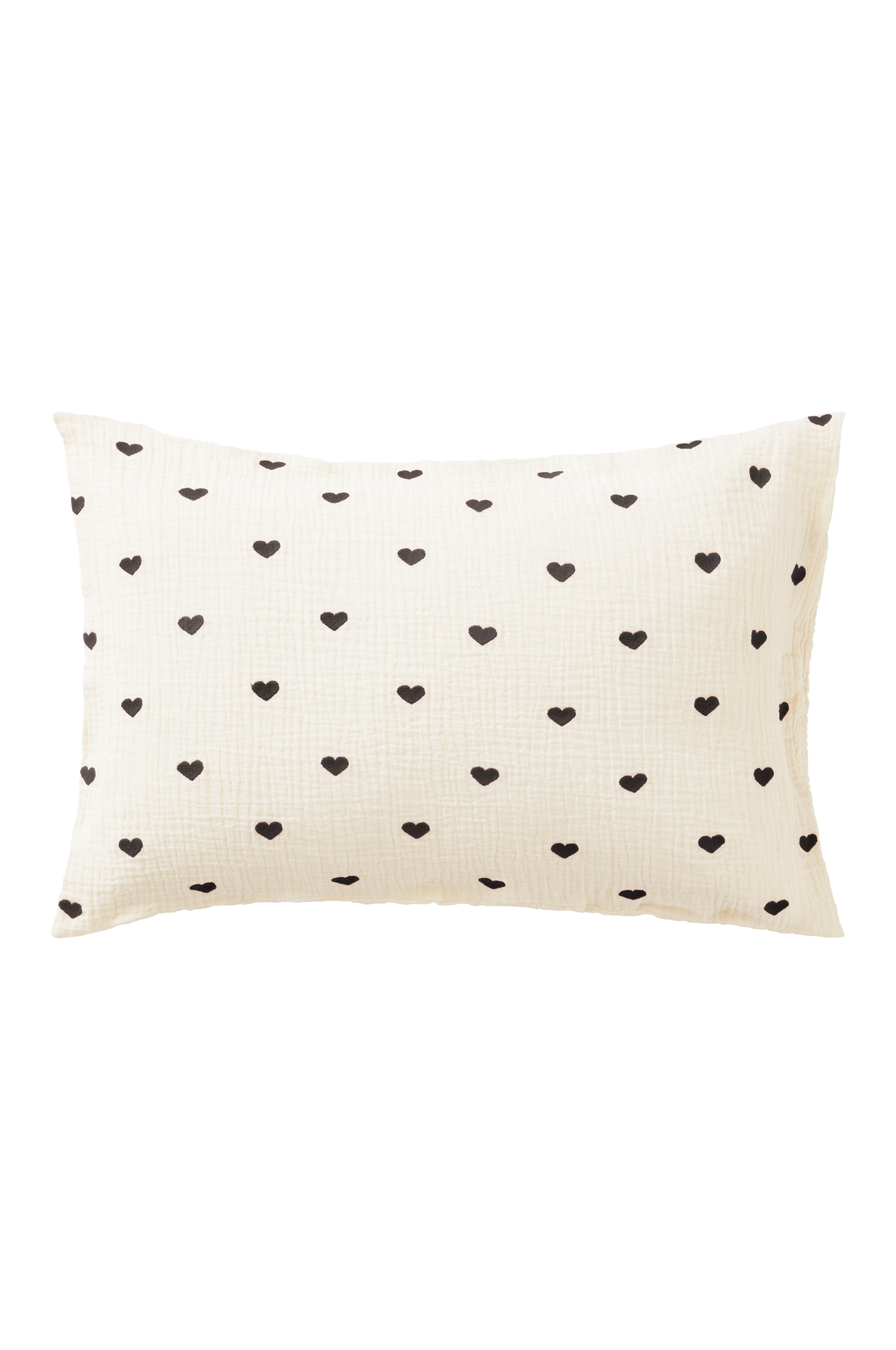Poszewka na poduszkę wykonana z przyjemnego, ekologicznego, bawełnianego muślinu haftowanego we wzór serc. Muślin jest miękką, delikatną tkaniną, tkaną w dwóch warstwach w taki sposób, aby powstały niewielkie wybrzuszenia, dzięki którym materiał jest miękki i łatwy w utrzymaniu. Nie wymaga prasowania ani maglowania. W tej wygodnej muślinowej tkaninie będzie się przyjemnie spać. Niewielka poszewka chroni prześcieradło, na przykład w łóżeczku, a także można ją łatwo i często zmieniać i równie często prać. Tylna strona pokryta jest gładką tkaniną. Gęstość splotu materiału wynosi 178 TC. (Gęstość splotu materiału oznacza ilość przeplecionych ze sobą nici, thread count, na cal kwadratowy materiału. Im wyższa gęstość tym lepsza jakość.)