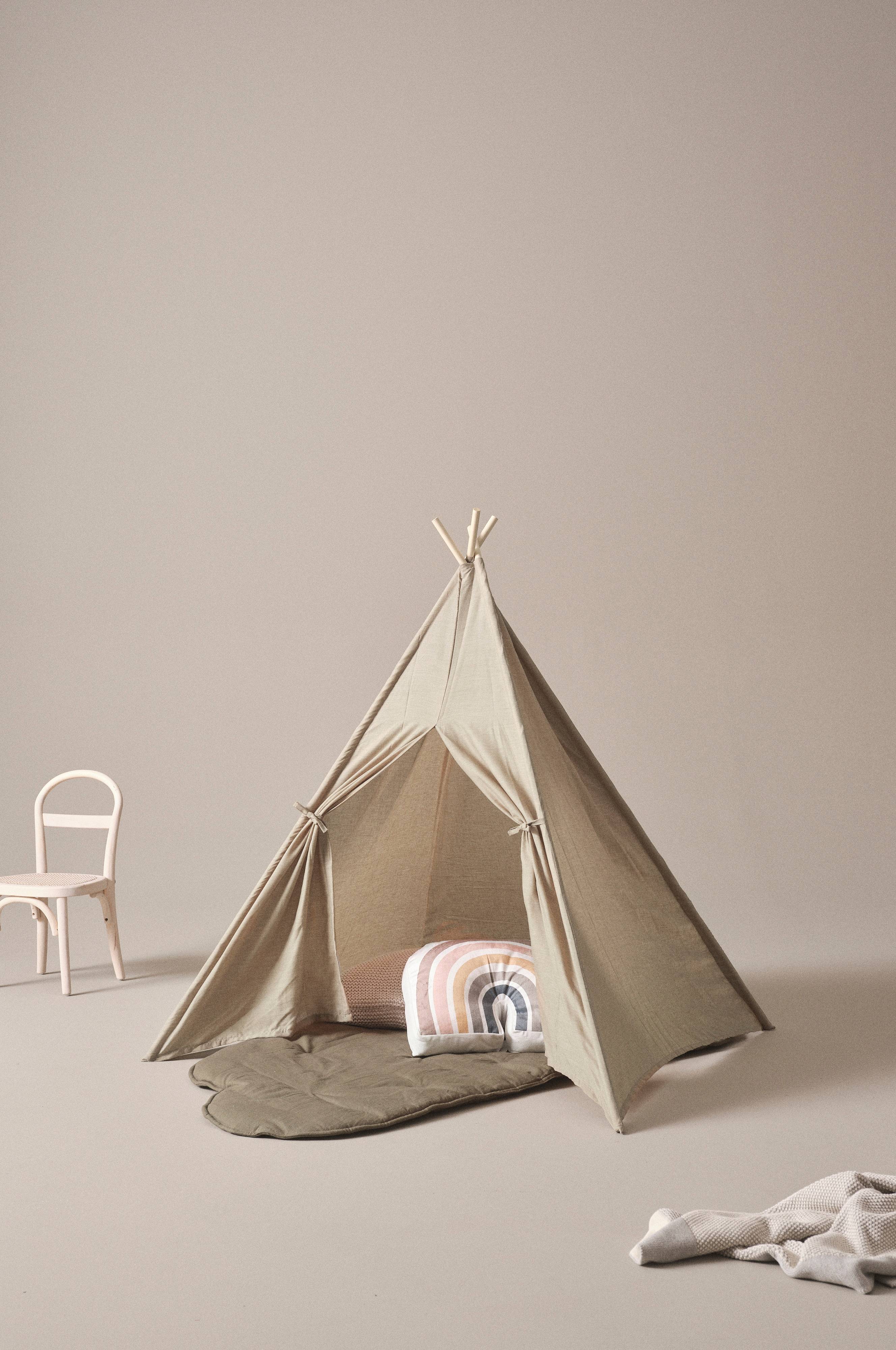 Dziecięcy namiot o czterech masztach do zabawy. Wejście z wiązanym frontem. Pokrycie namiotu wykonane jest z miękkiego poliestru imitującego aksamit. Namiot sprawdzi się podczas zabawy i czytania bajek, a także stanie się wspaniałym elementem wystroju dziecięcego pokoju.