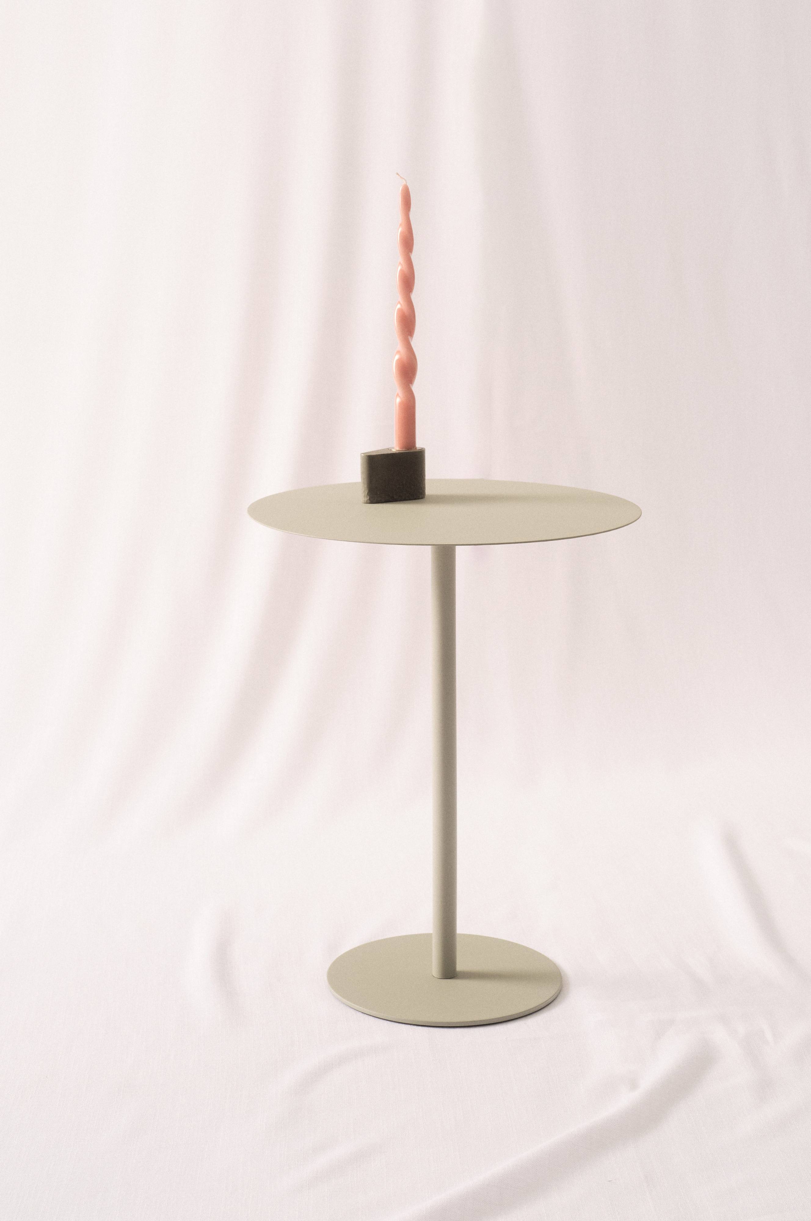 Okrągły stolik z żelaza. Cienki blat i wąska noga sprawiają, że HEBY odznacza się eleganckim charakterem. Stolik jest gładki i pomalowany proszkowo matową farbą.