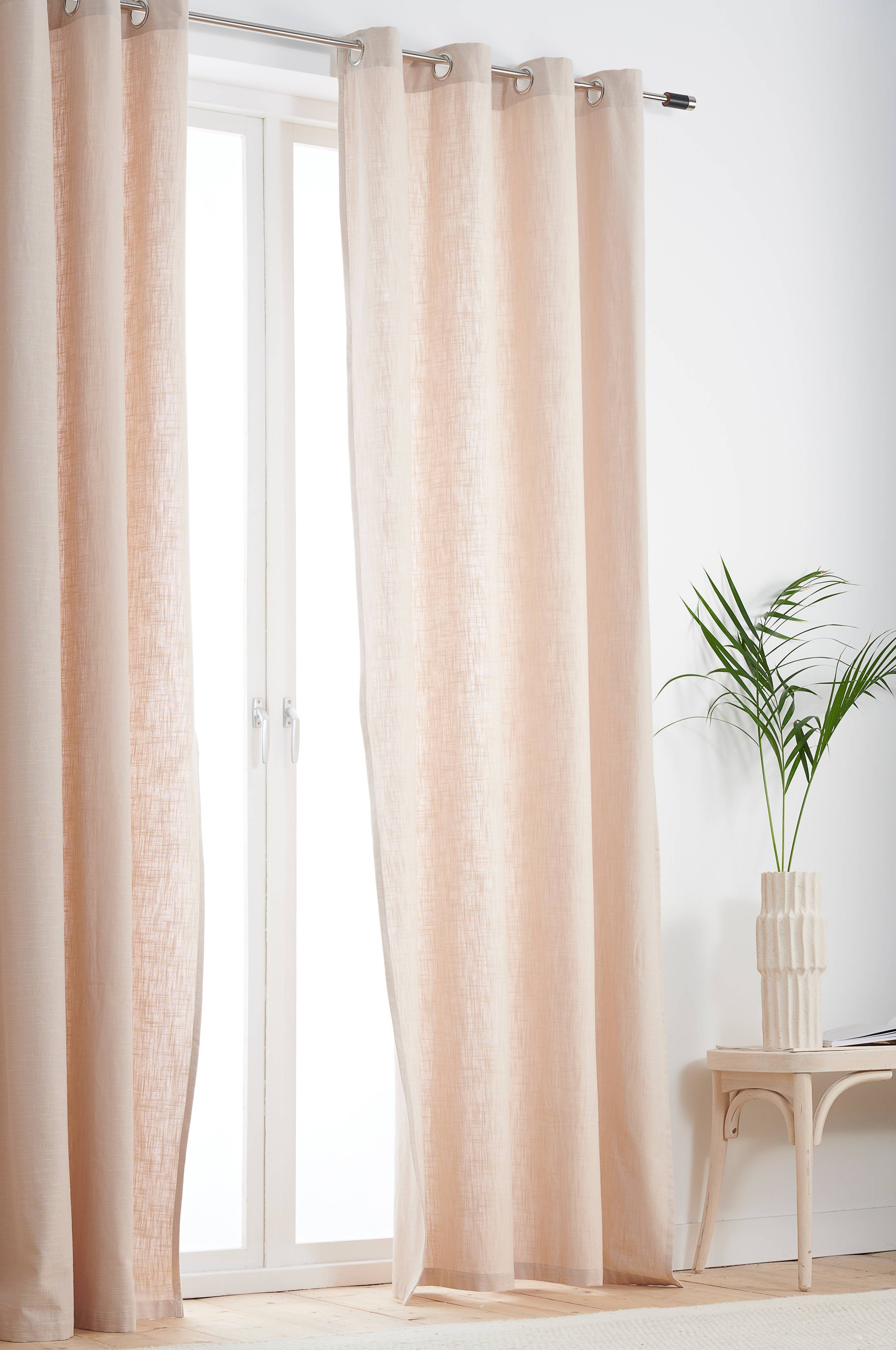 2 gładkie zasłony z bawełny na przelotkach. W każdej zasłonie znajduje się 8 oczek. Do zawieszenia bezpośrednio na karniszu.