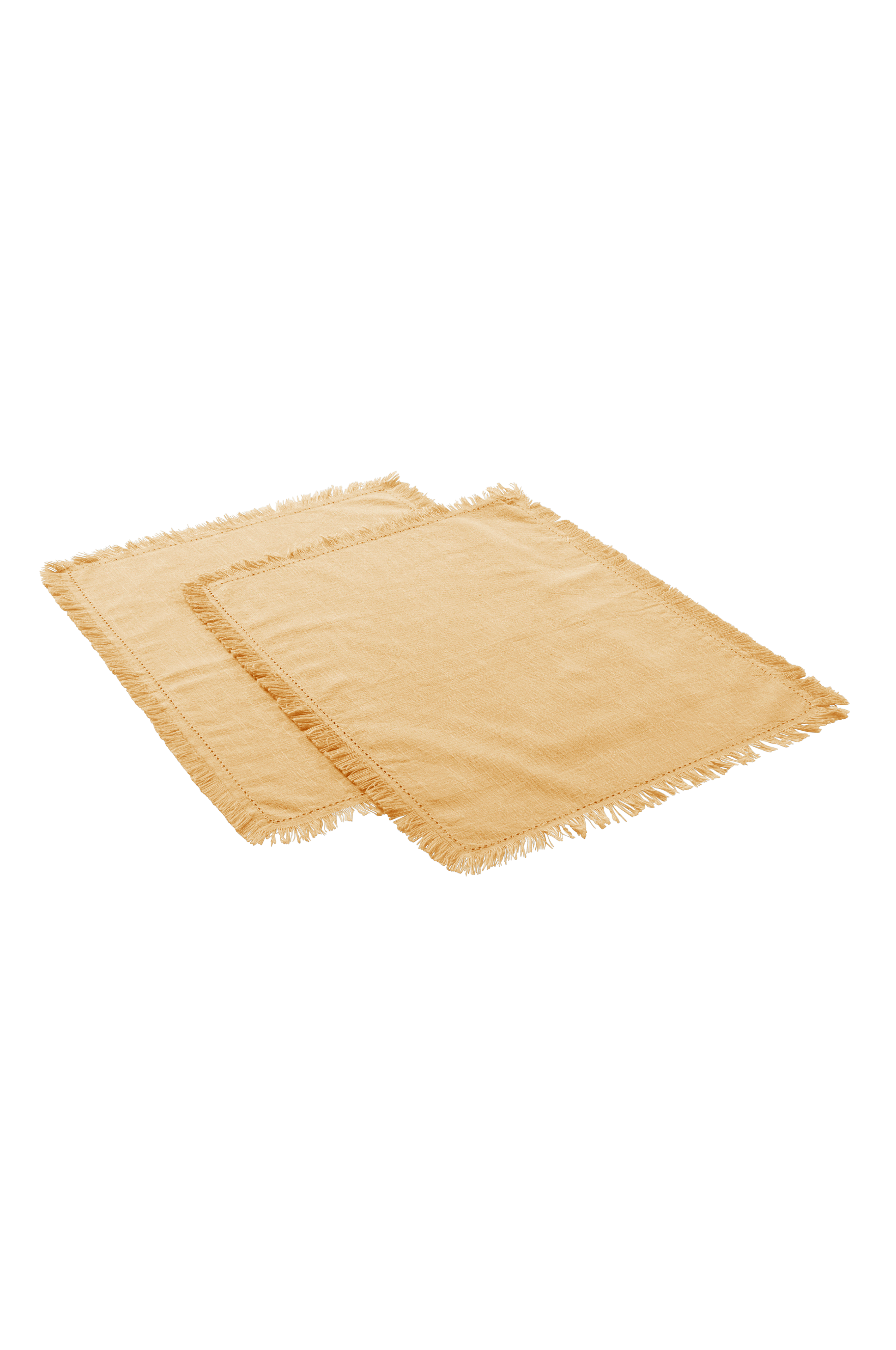 2 maty stołowe z gładkiej bawełny z dekoracyjnymi frędzlami wzdłuż boków. Kiedy urządzasz pokój jednokolorowymi tkaninami warto puścić wodze fantazji przy wyborze tapet, porcelany i detali.