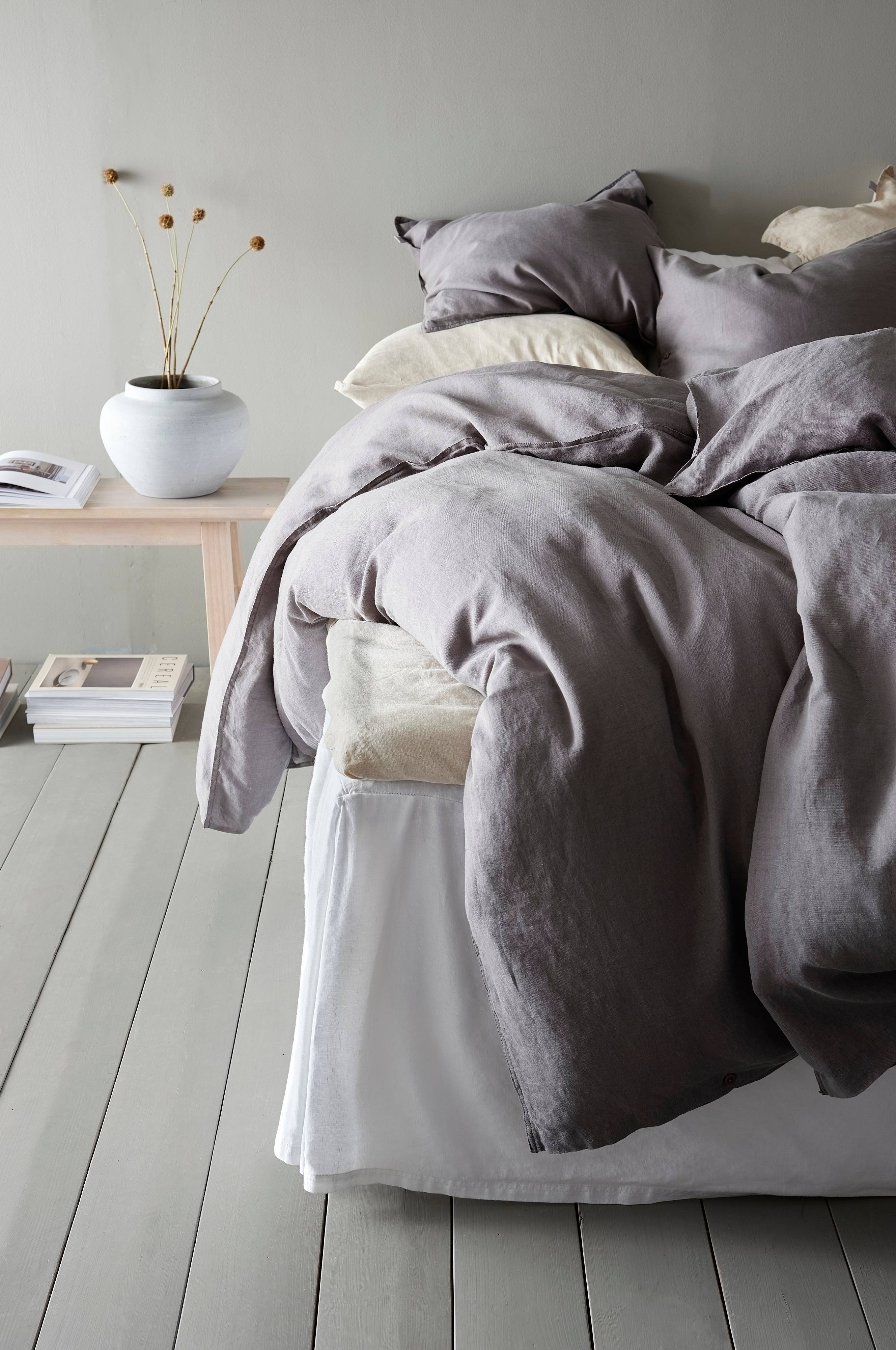 Poszwa na kołdrę ze spranej mieszanki lnu i bawełny. Podwójne szwy i zapięcie na guziki. Gęstość splotu materiału wynosi 92 TC. (Gęstość splotu materiału oznacza ilość przeplecionych ze sobą nici, thread count, na cal kwadratowy materiału. Im wyższa gęstość tym lepsza jakość. Tkaniny z lnu lub mieszanki lnu często mają rzadszy splot, co przekłada się na wygodę używania.)