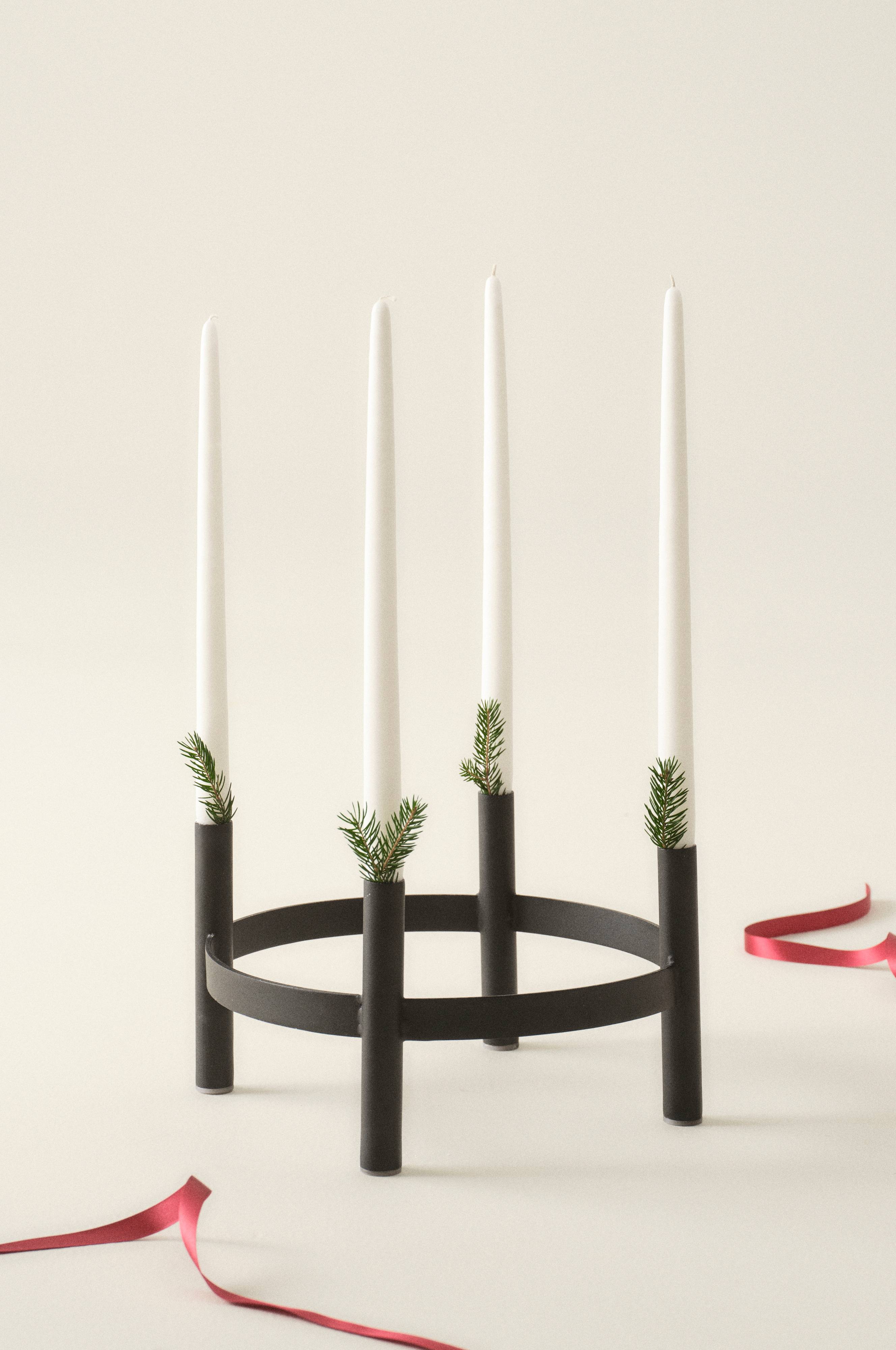 Świecznik z żelaza. Okrągły świecznik jest surowy, stylowy i mieści cztery świece. Jest piękny w swej prostocie, ale możesz go też udekorować splecionymi gałązkami lub wstążką. Czarny ma matową, lakierowaną proszkowo powierzchnię, a srebrny na szczotkowane wykończenie. HENRY wspaniale sprawdzi się jako świecznik adwentowy, ale będzie pasować również do przyjęć w środku lata. To świecznik, który będzie się sprawdzać przez cały rok i będzie równie piękny na co dzień i od święta. Świece sprzedawane są osobno.