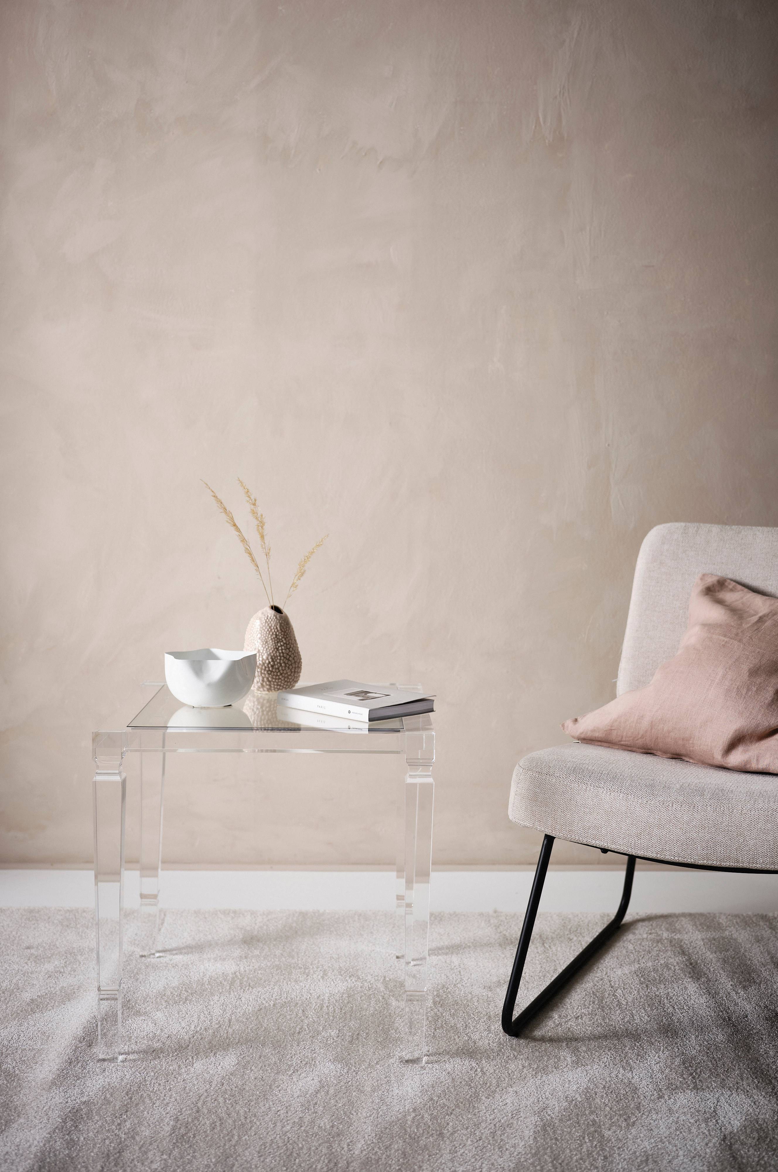 Czworokątny, przezroczysty stolik z nogami ze szkła akrylowego i blatem ze szkła hartowanego. Stolik jest elegancki i wykonany z lekkich stylowych materiałów.