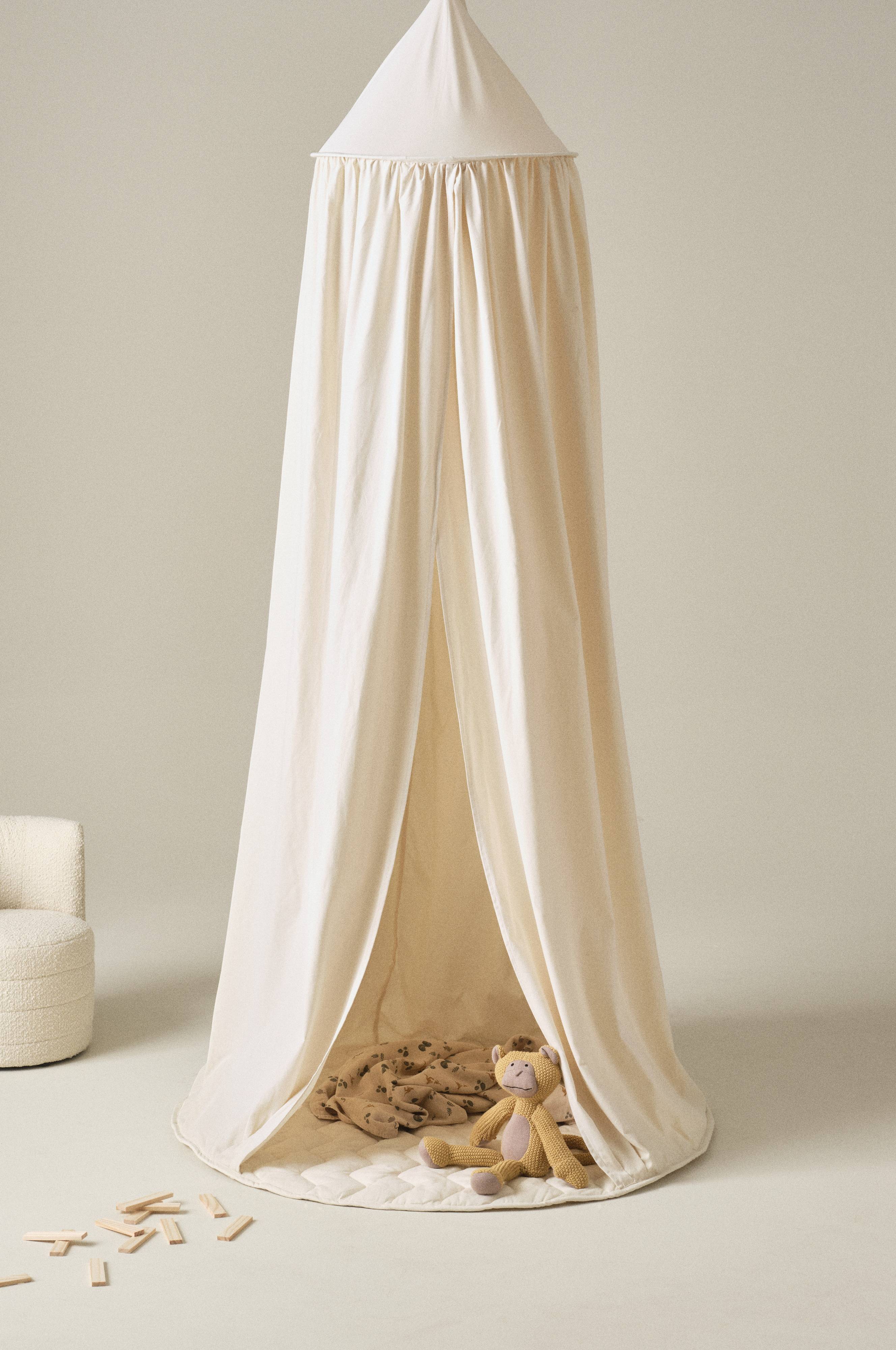 Okrągły namiot z tkaniny bawełnianej. Podłoga namiotu jest watowana i pikowana, co zapewnia dziecku miękkie siedzenie. Namiot zachowuje swój kształt dzięki metalowej obręczy wszytej w szczyt. Zawieś na wbitym w sufit haku, a opadający ku podłodze namiot stworzy przytulne schronienie w pokoju dziecięcym.