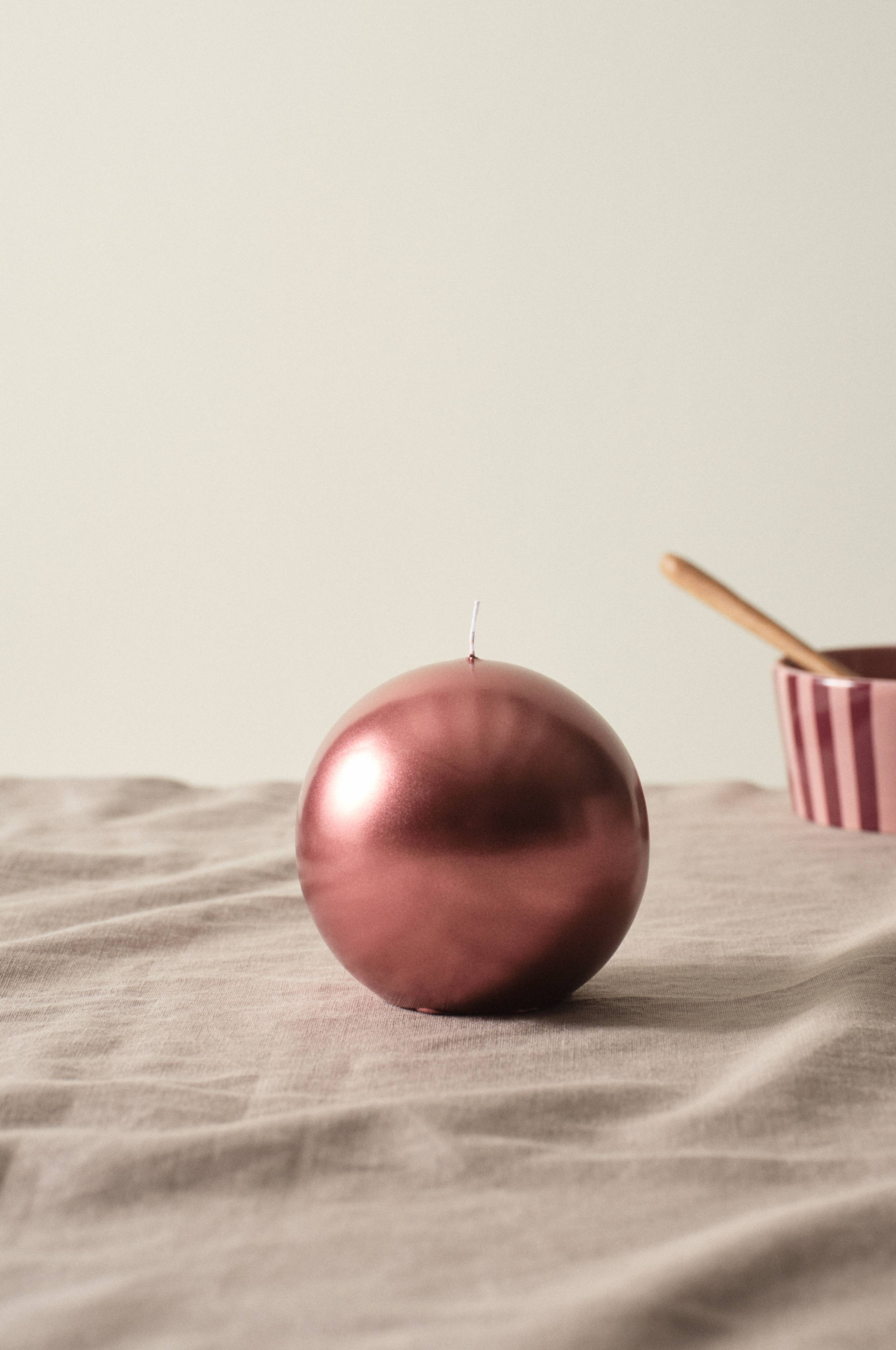 Świeca kula wykonana z parafiny, zanurzona później w kolorze o metalicznym połysku. Ta okrągła, urocza świeca została wykonana ręcznie w Szwecji. Paląca się świeca stworzy przytulny nastrój po zapadnięciu ciemności. Parafina wspaniale się spala, a znak jakości RAL gwarantuje, że paląc się parafina daje niewiele sadzy i dymu.