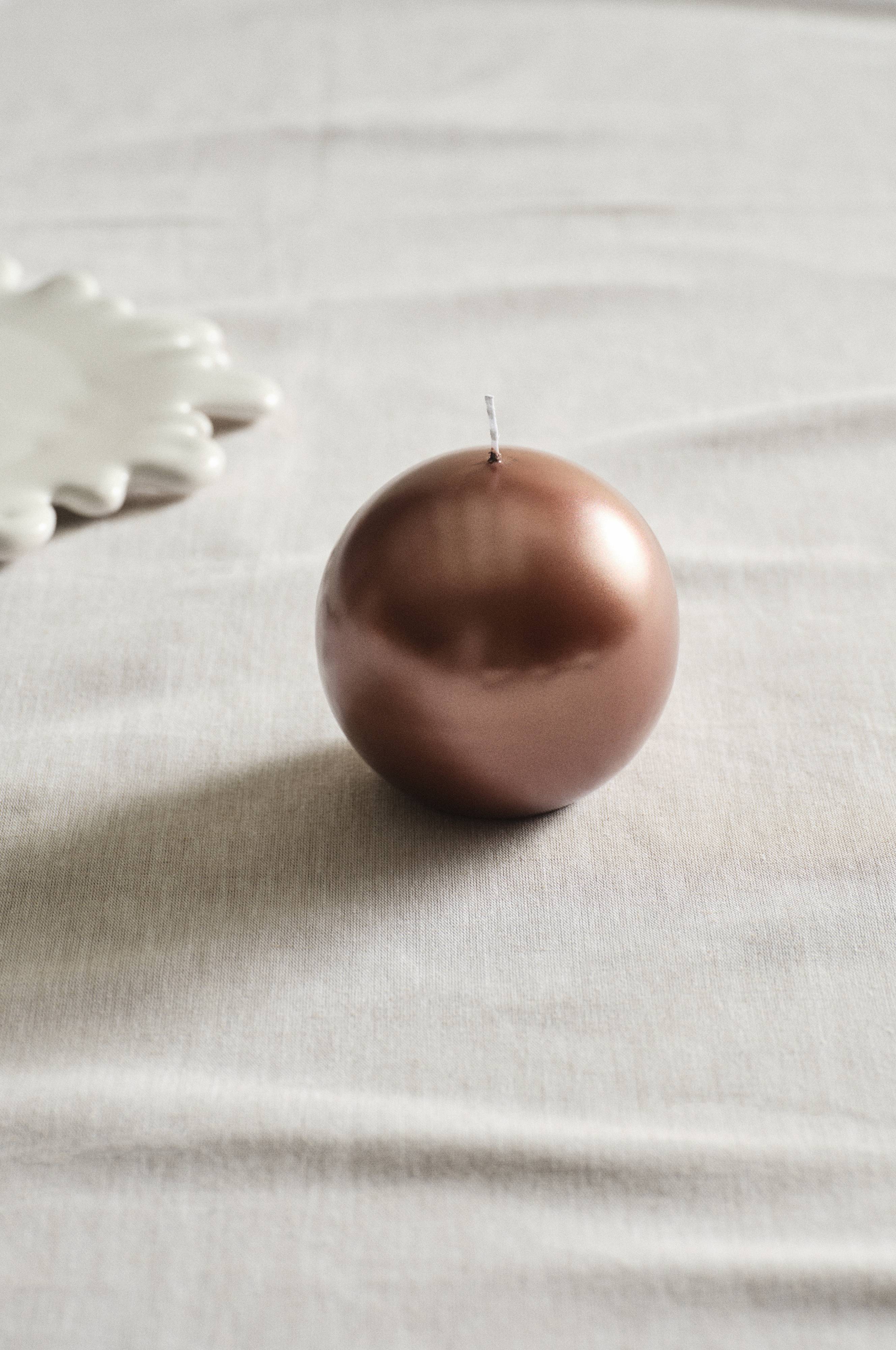 Świeca kula wykonana z parafiny, zanurzona później w kolorze o metalicznym połysku. Ta okrągła, urocza świeca została wykonana ręcznie w Szwecji. Paląca się świeca stworzy przytulny nastrój po zapadnięciu ciemności. Parafina wspaniale się spala, a znak jakości RAL gwarantuje, że paląc się parafina daje niewiele sadzy i dymu.